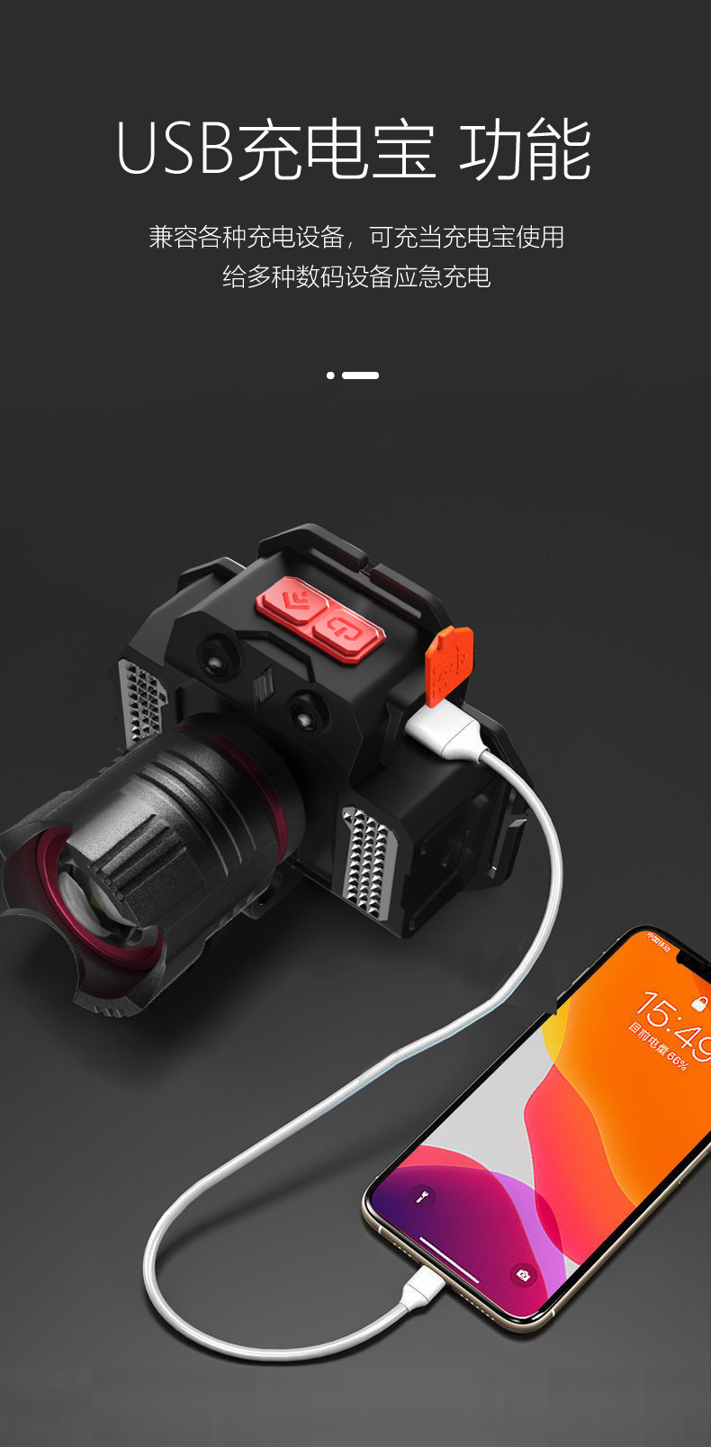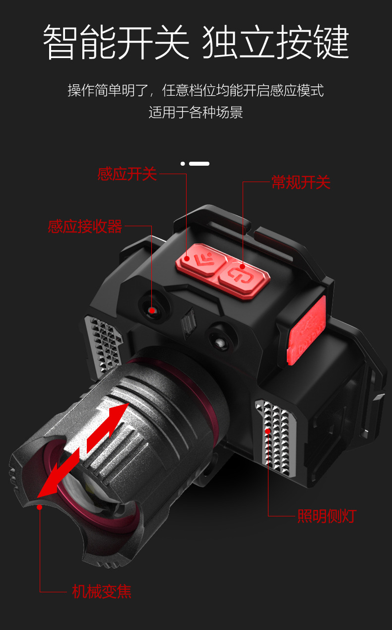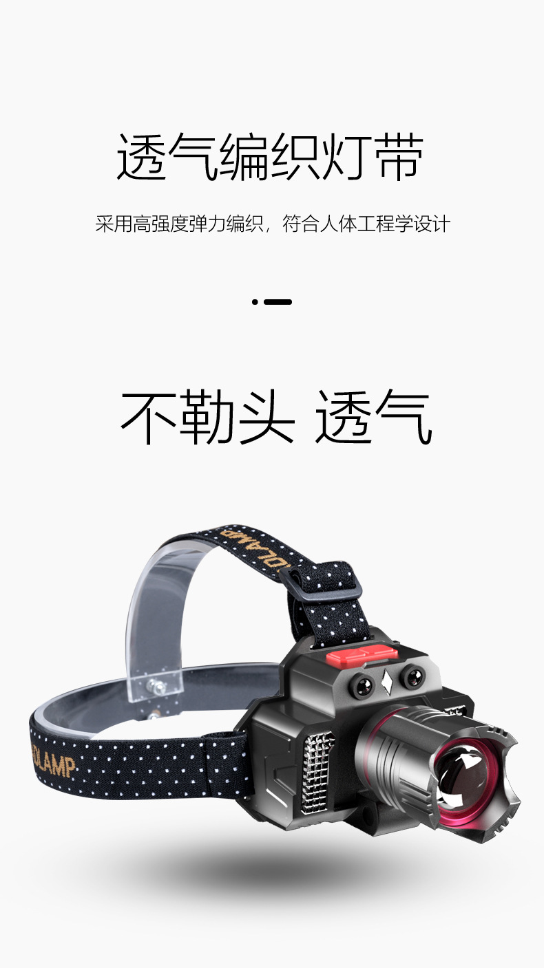 크로스 보더 강한 조명 유도 전조등 USB 충전 텔레스코픽 포커싱 비상 측면 조명 헤드 마운트 실외 조명 손전등
