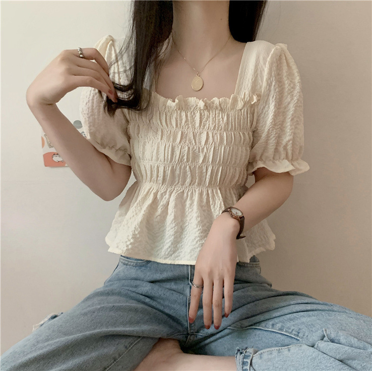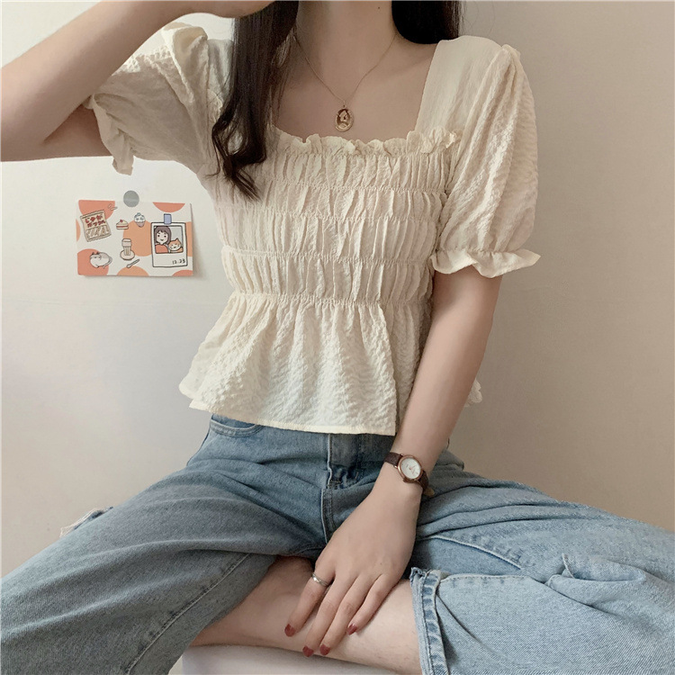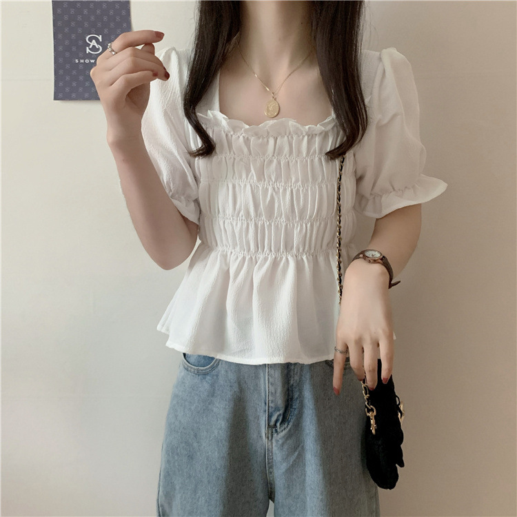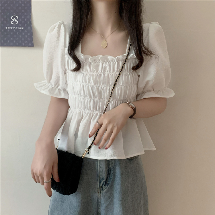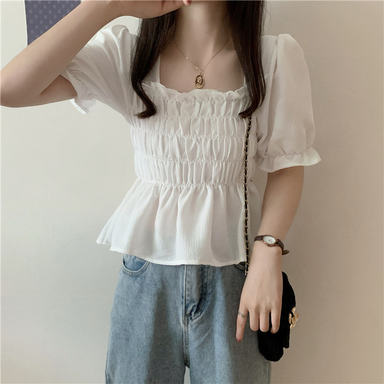 프렌치 퍼프 슬리브 스퀘어 칼라 셔츠 여성용 주름 디자인 쉬폰 셔츠 여름 꽉 허리 슬림 배꼽 덮개 탑스토어 가기