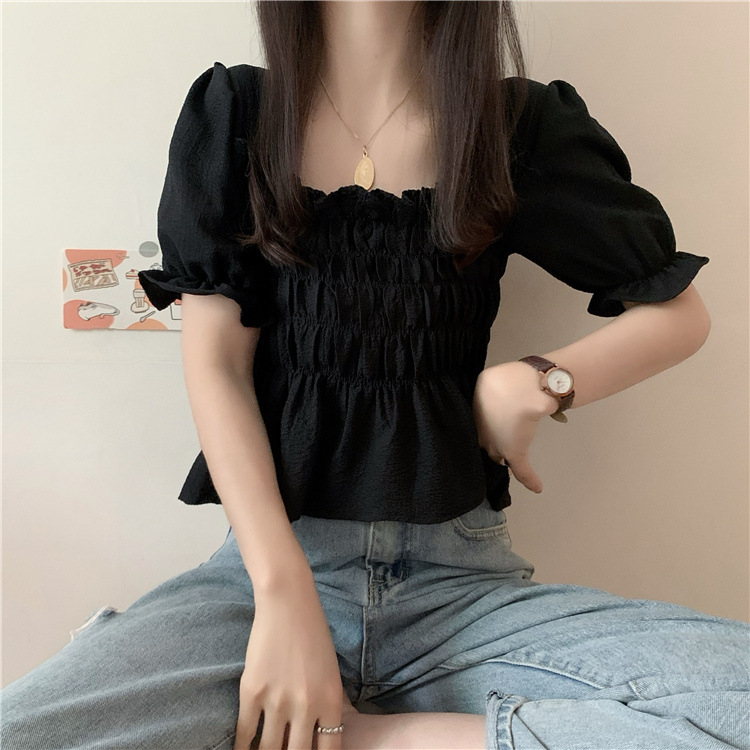 프렌치 퍼프 슬리브 스퀘어 칼라 셔츠 여성용 주름 디자인 쉬폰 셔츠 여름 꽉 허리 슬림 배꼽 덮개 탑