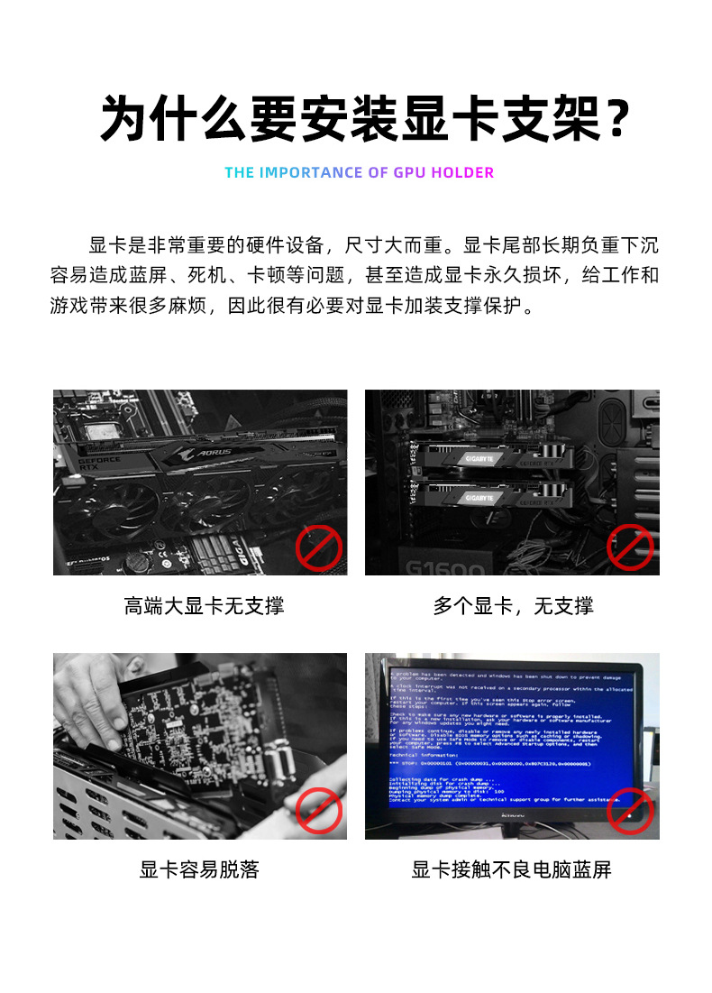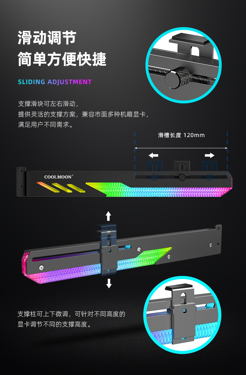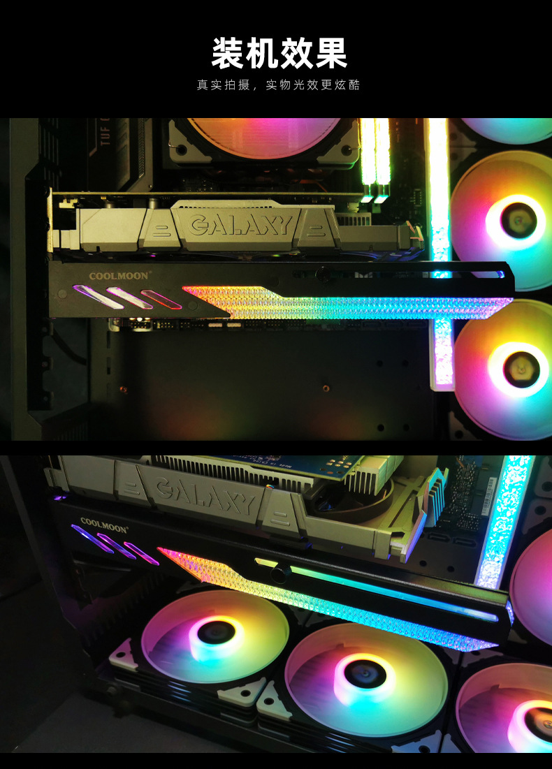 GT8横装显卡支架,支持ARGB炫酷神光同步,强固支撑显卡,兼容大部分的电脑机箱,单个彩盒包装,60pcs/box,单箱尺寸:35*33*26cm,10.9kg/box,支持跨境销售,可提供图片包,品牌直营,现货供应,欢迎咨询下单!注:由于产品升级,黑白色彩盒尺寸不同,不同批次随机发货,谢谢!