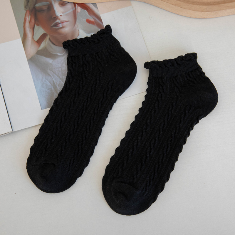 단색 여성 양말 제조 업체 공급 귀여운 일본 레이스 보트 양말 여름 낮은 탑 나무 귀 짧은 튜브 jk 양말 도매