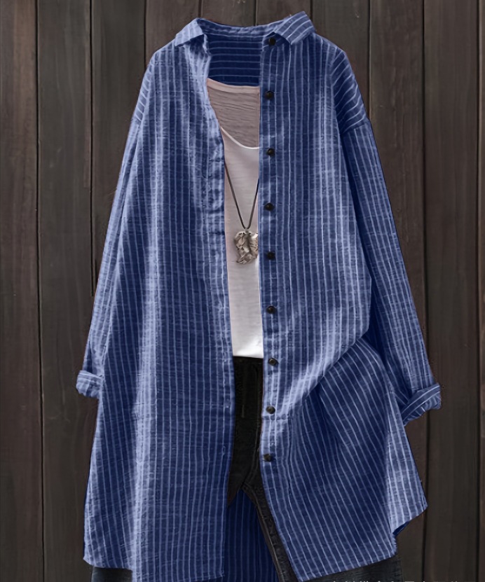 많은 재고 있음 Amazon 신상 여성 문학 면 린넨 스트라이프 셔츠 중간 길이 긴팔 대형 포켓 탑