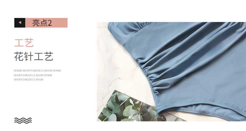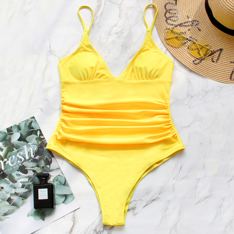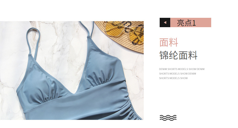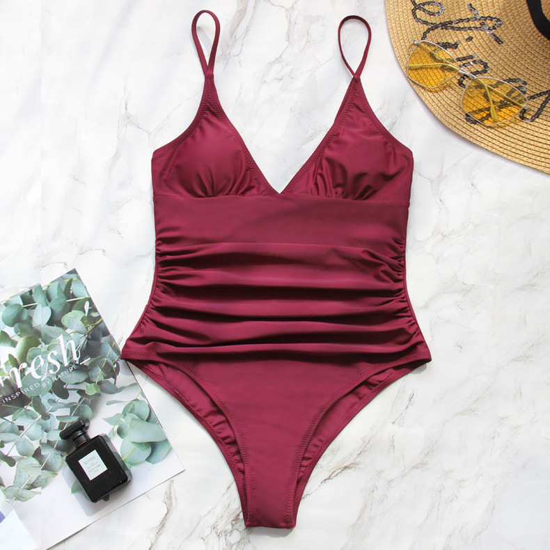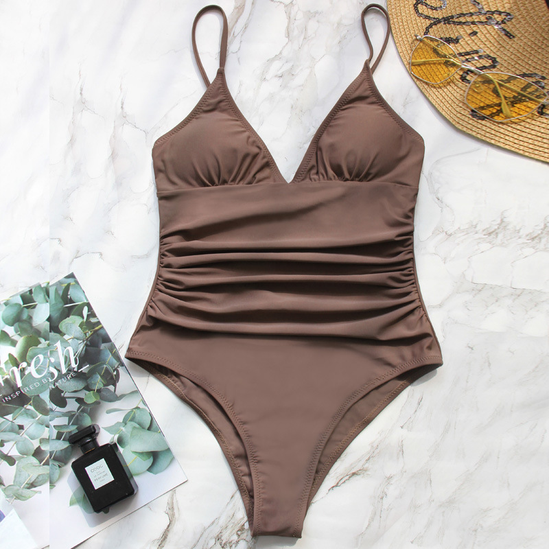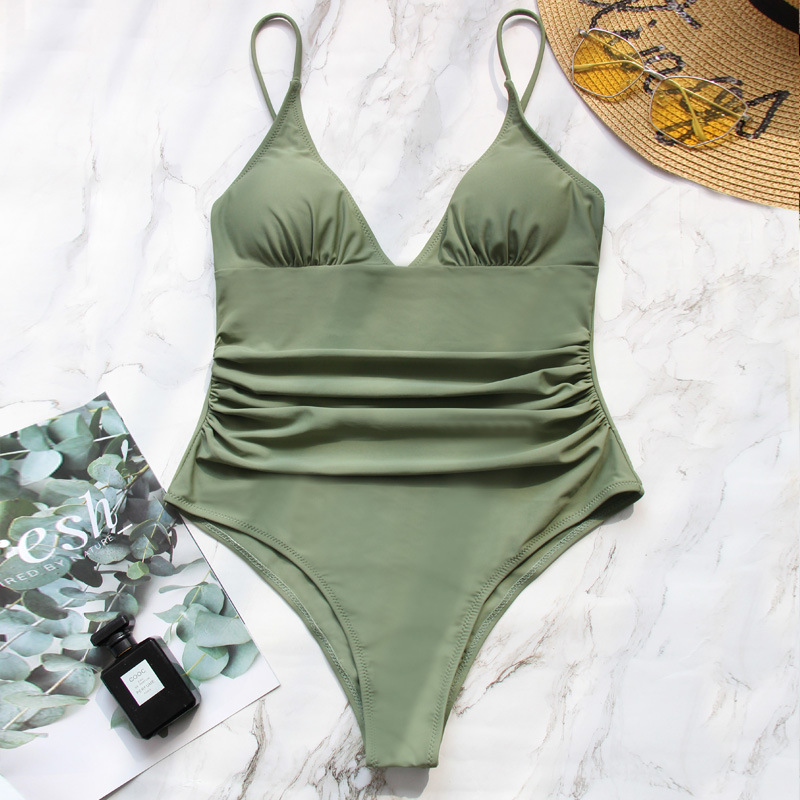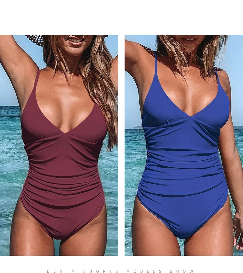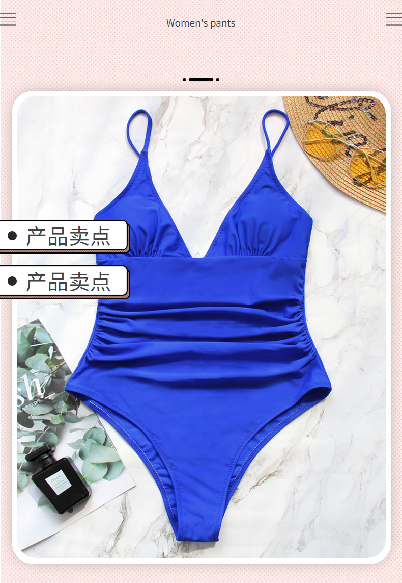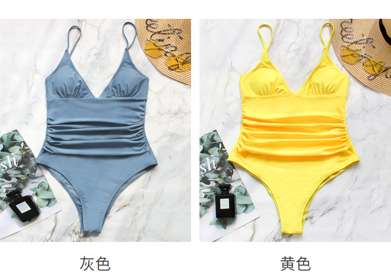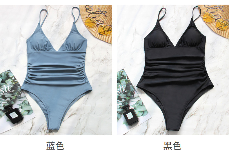 2022跨境新款比基尼 性感深V纯色遮肚连体泳衣女