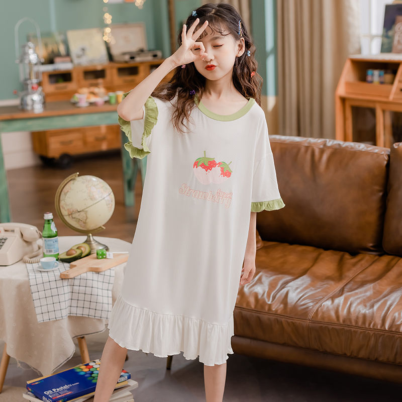 여아 잠옷 여름 어린이 얇은 공주 가정복 에어컨 옷 여아 중간 및 큰 어린이 반팔 원피스 잠옷