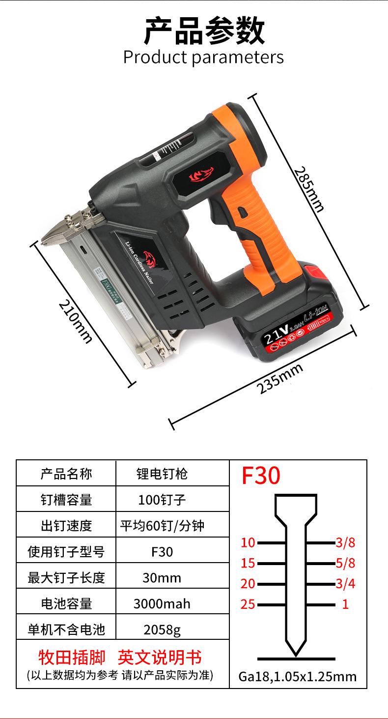 리튬 전기 네일 건 F30 네일 건 가정용 단발 자동 네일 목공 코드 네일 건 무선 구속