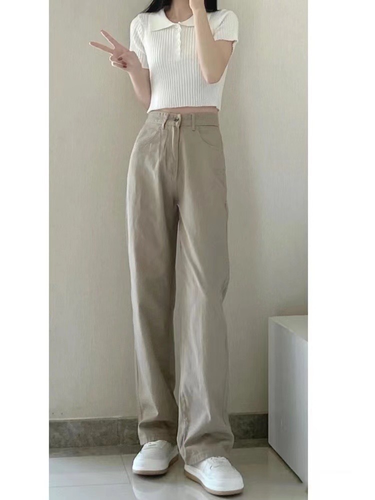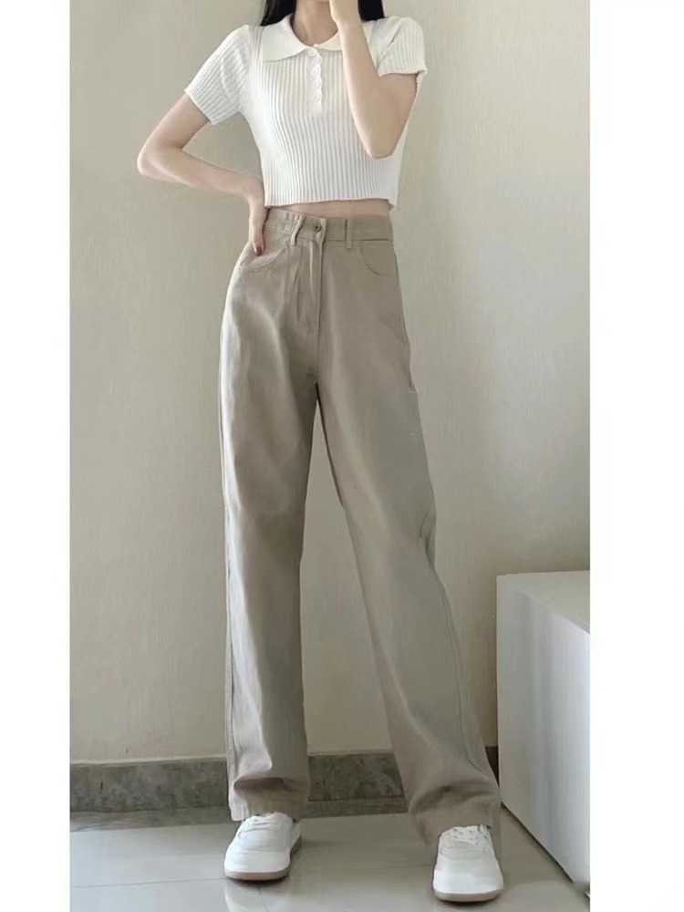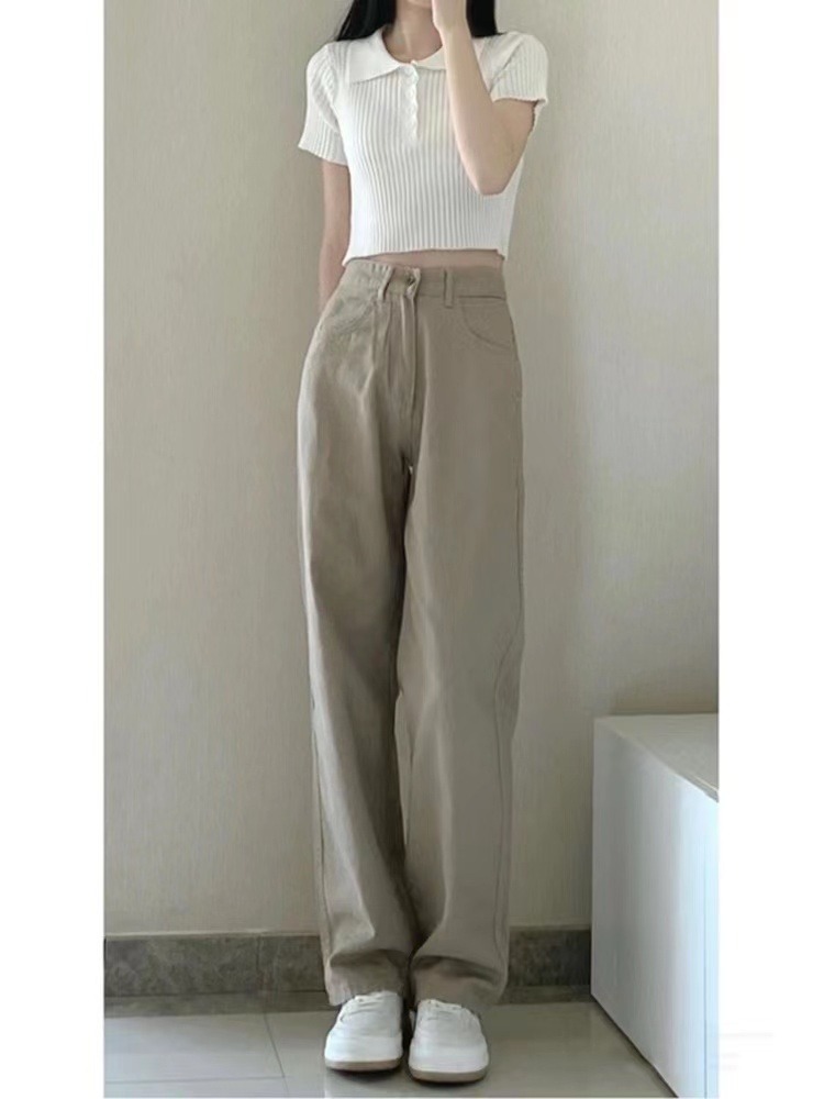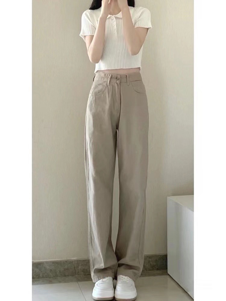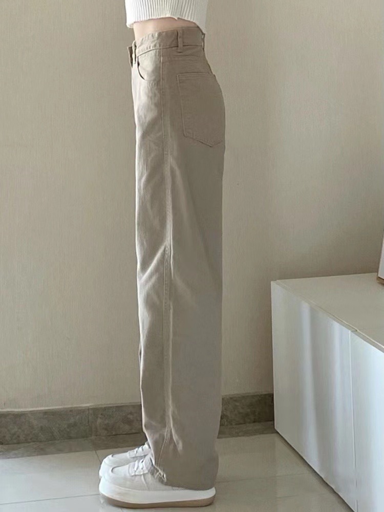 카키색 여성용 스트레이트 데님 팬츠, 하이웨이스트, 슬림핏, 작은 체형에도 잘 어울리는, 활용도 높은 루즈핏 와이드 팬츠, 통근 스타일, 루즈핏