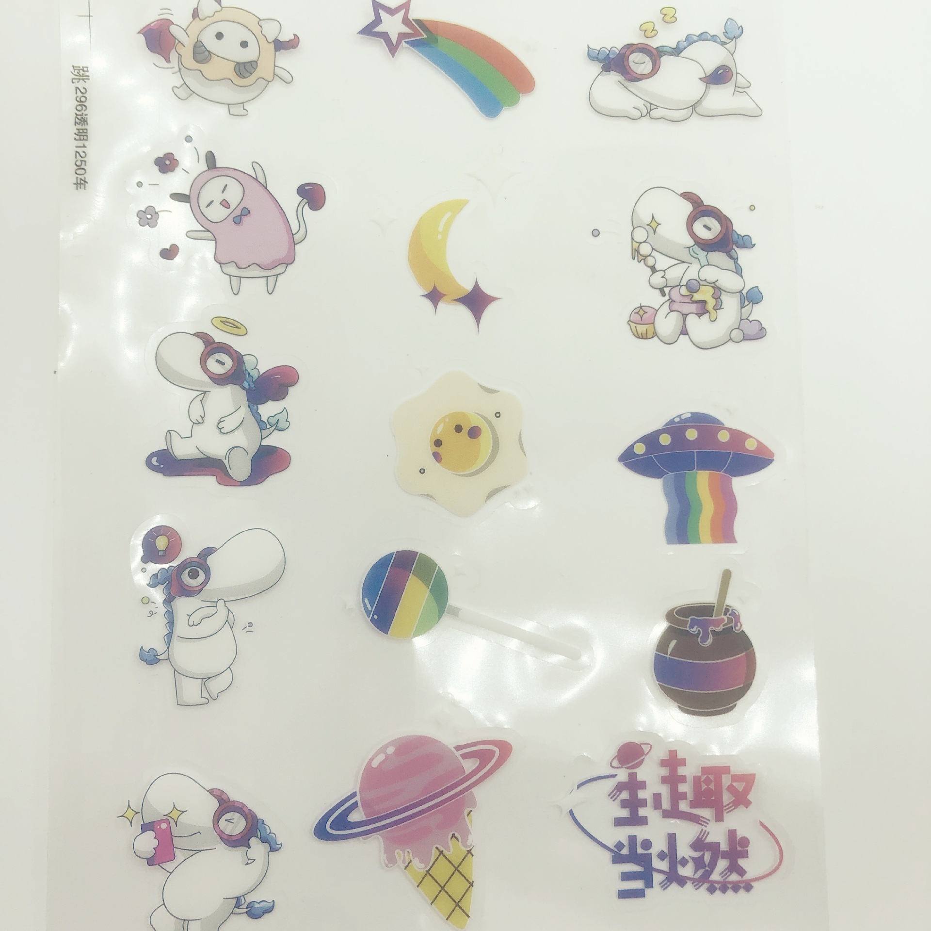 贴纸:一张含有15个不同图案,每个图都分别有模切外轮廓,图案平均宽度约1-3cm不等,