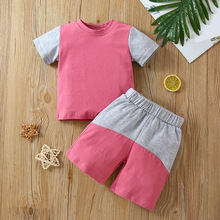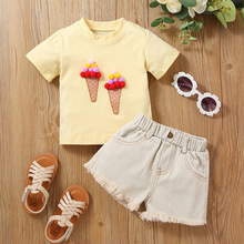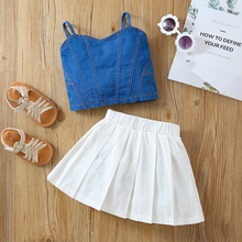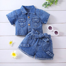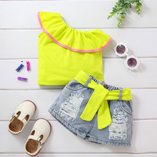 아마존 AliExpress 크로스 보더 핫 걸스 달콤한 편지 핑크 조끼 + 데님 찢어진 반바지 투피스 세트
