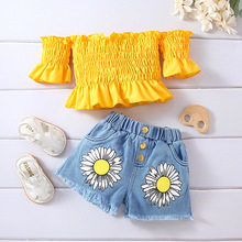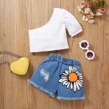 아마존 AliExpress 크로스 보더 핫 걸스 달콤한 편지 핑크 조끼 + 데님 찢어진 반바지 투피스 세트스토어 가기