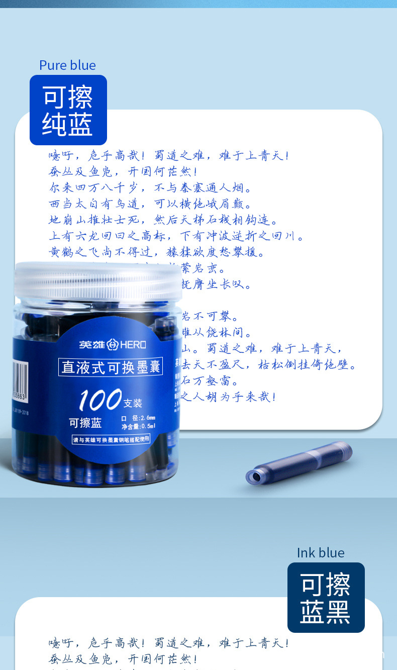 히어로 다이렉트 액체 펜 잉크 주머니 잉크 2.6mm 3 학년 초등 학생용 범용 지울 수있는 파란색 3.4 구경스토어 가기