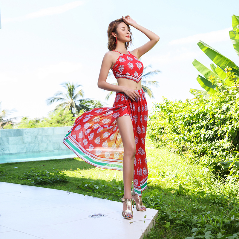 크로스 보더 스타일 여름 스플릿 스커트 수영복 여성용 인쇄 섹시한 기질 등이없는 수영복 제조 업체스토어 가기