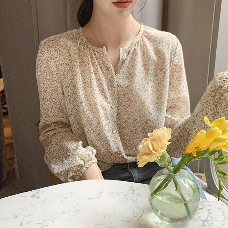 패션 꽃 쉬폰 셔츠 긴 소매 이른 가을 복고풍 홍콩 스타일 달콤한 느슨한 퍼프 슬리브 작은 셔츠 여성을위한 세련된 탑