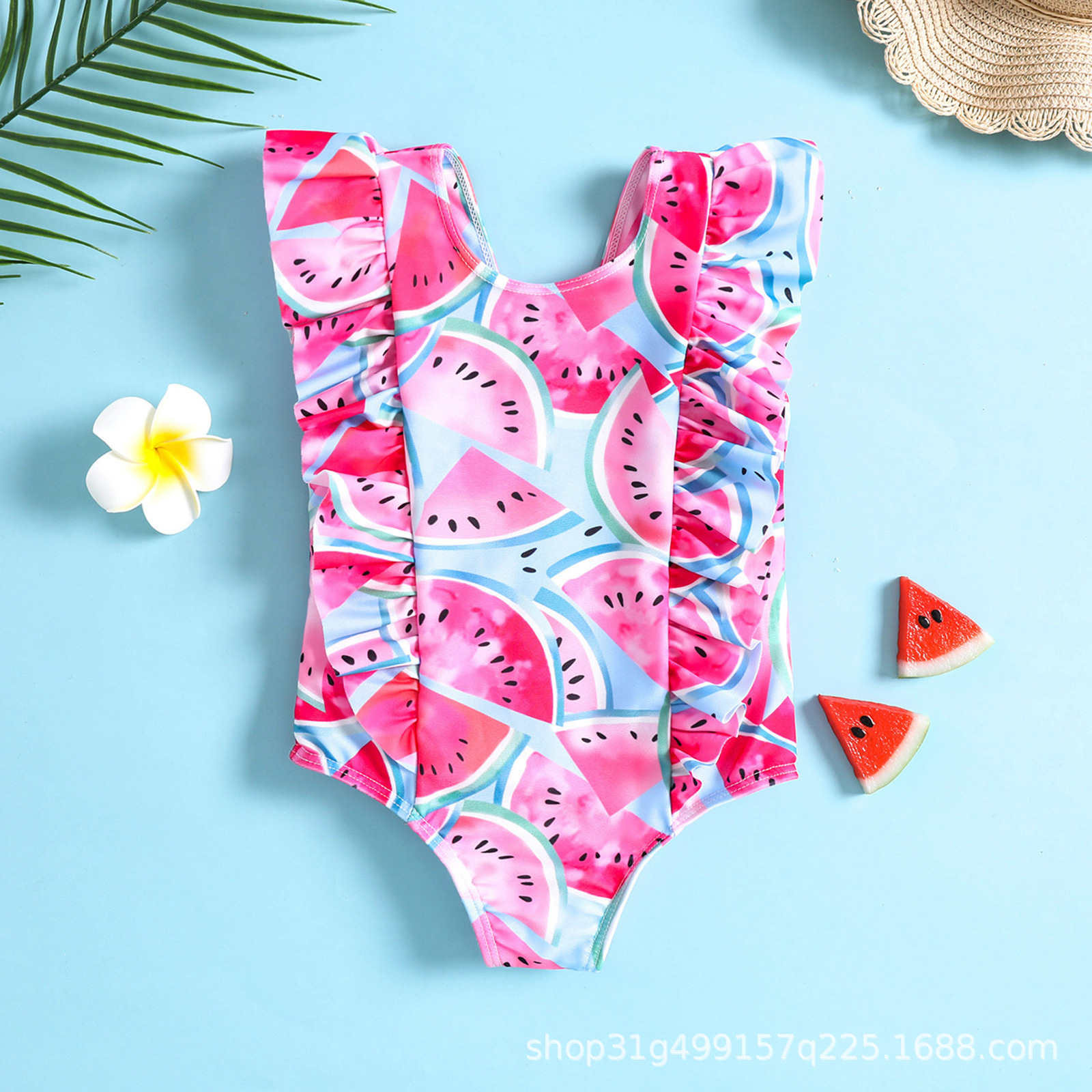 수박 프린트 프릴 소녀 원피스 삼각형 아기 소녀 온천 해변 수영복 버블 슬리브 태양 보호