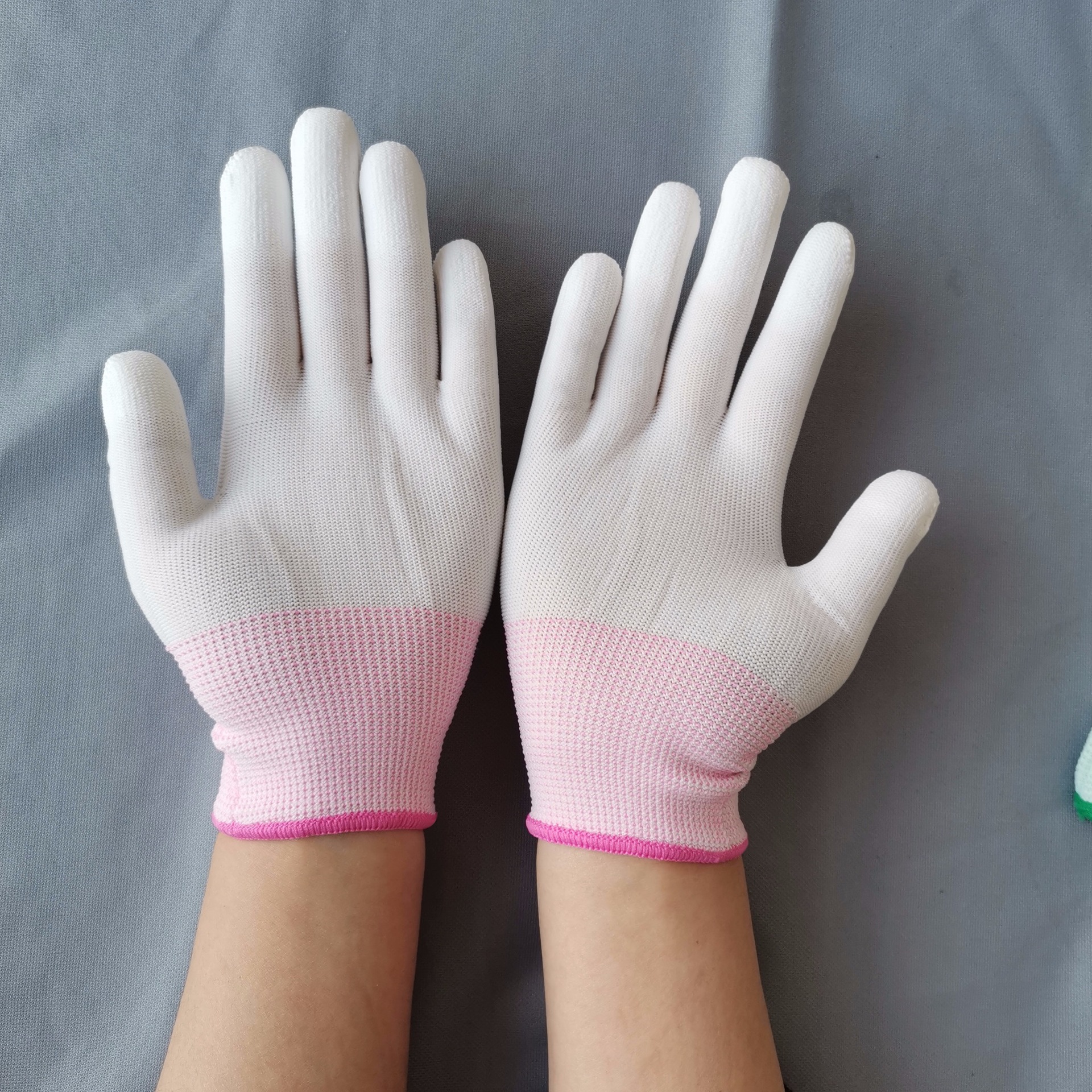 여성용 얇은 흰색 PU 접착제 장갑 13 핀 흰색 나일론 핑거 코팅 통기성 먼지 없는 작업 장갑