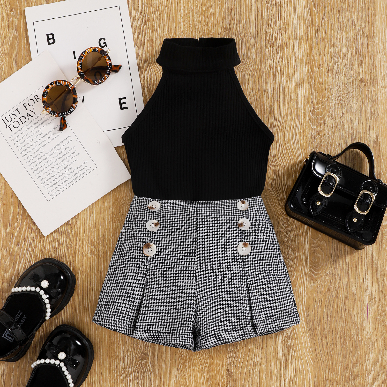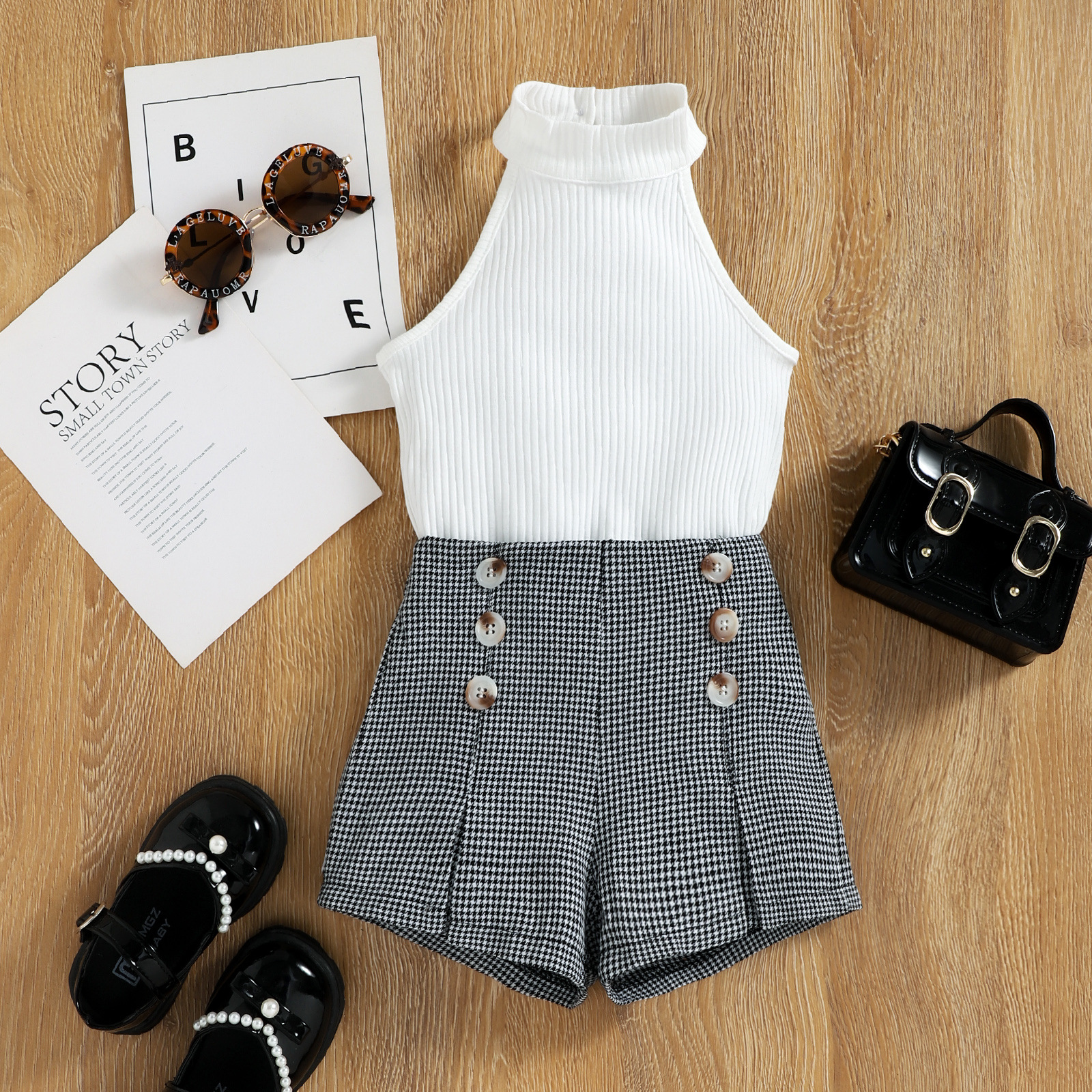 Baosheng 아동복 여름 여성 중소형 어린이 목 핏 조끼 Houndstooth 반바지 영국 투피스 세트 재고스토어 가기