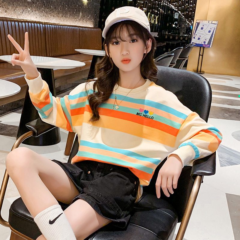 여아 봄과 가을 스트라이프 탑 풀오버 탄성 느슨한 한국어 다채로운 컬러 스트라이프 중학교 어린이 무지개 비만을위한 큰 패션스토어 가기