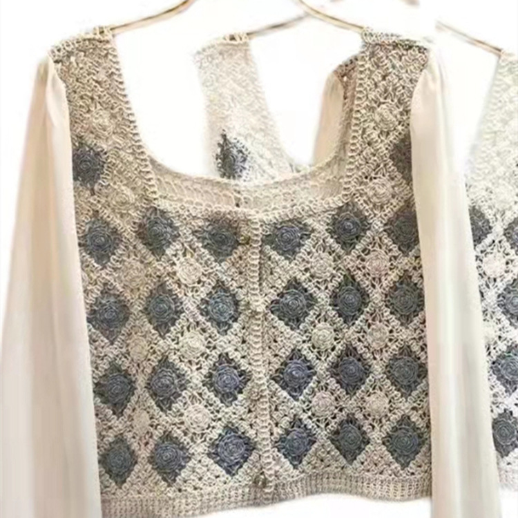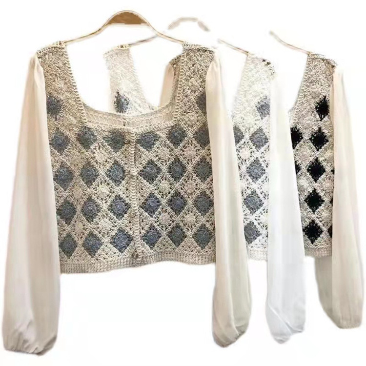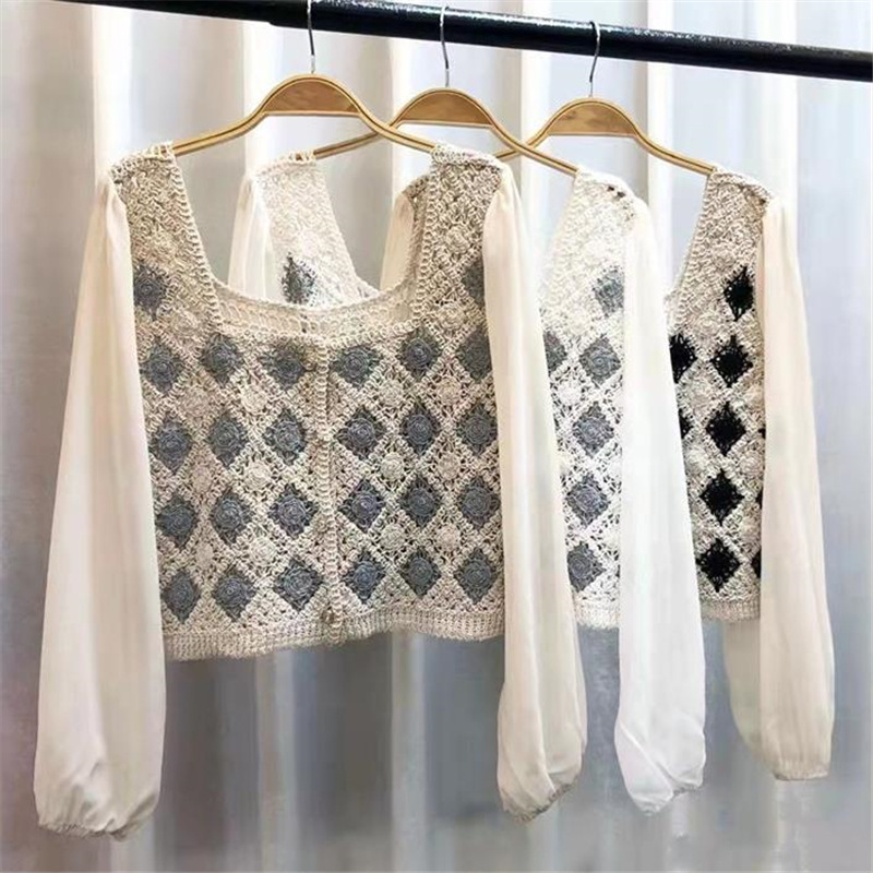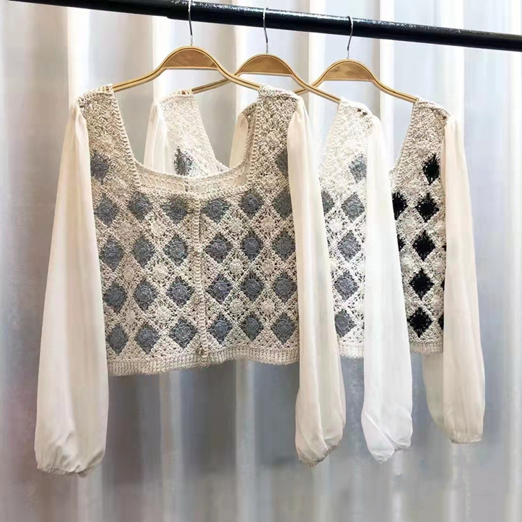 프랑스 스타일 빈티지 쉬폰 스티치 웨스턴 스타일 셔츠 여성의 디자인 감각 틈새 자수 중공 스퀘어 칼라 짧은 시크 탑
