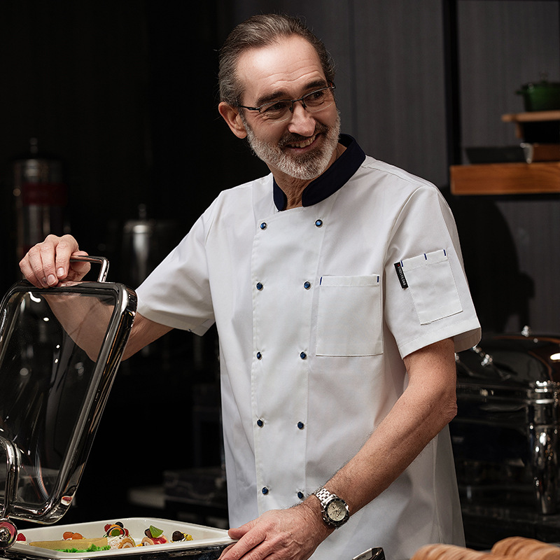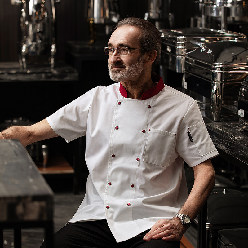 여름 새 요리사 의류 반팔 탑 주방 호텔 통기성 남성 및 여성 작업복 화이트 레드 칼라 호텔 더블