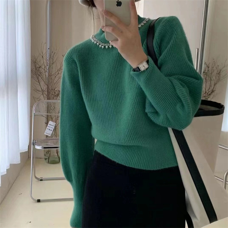 라운드 넥 풀오버 페르시 스웨터 2023 가을 새로운 단색 느슨한 두꺼운 스웨터 여성 랜턴 슬리브 기본 셔츠