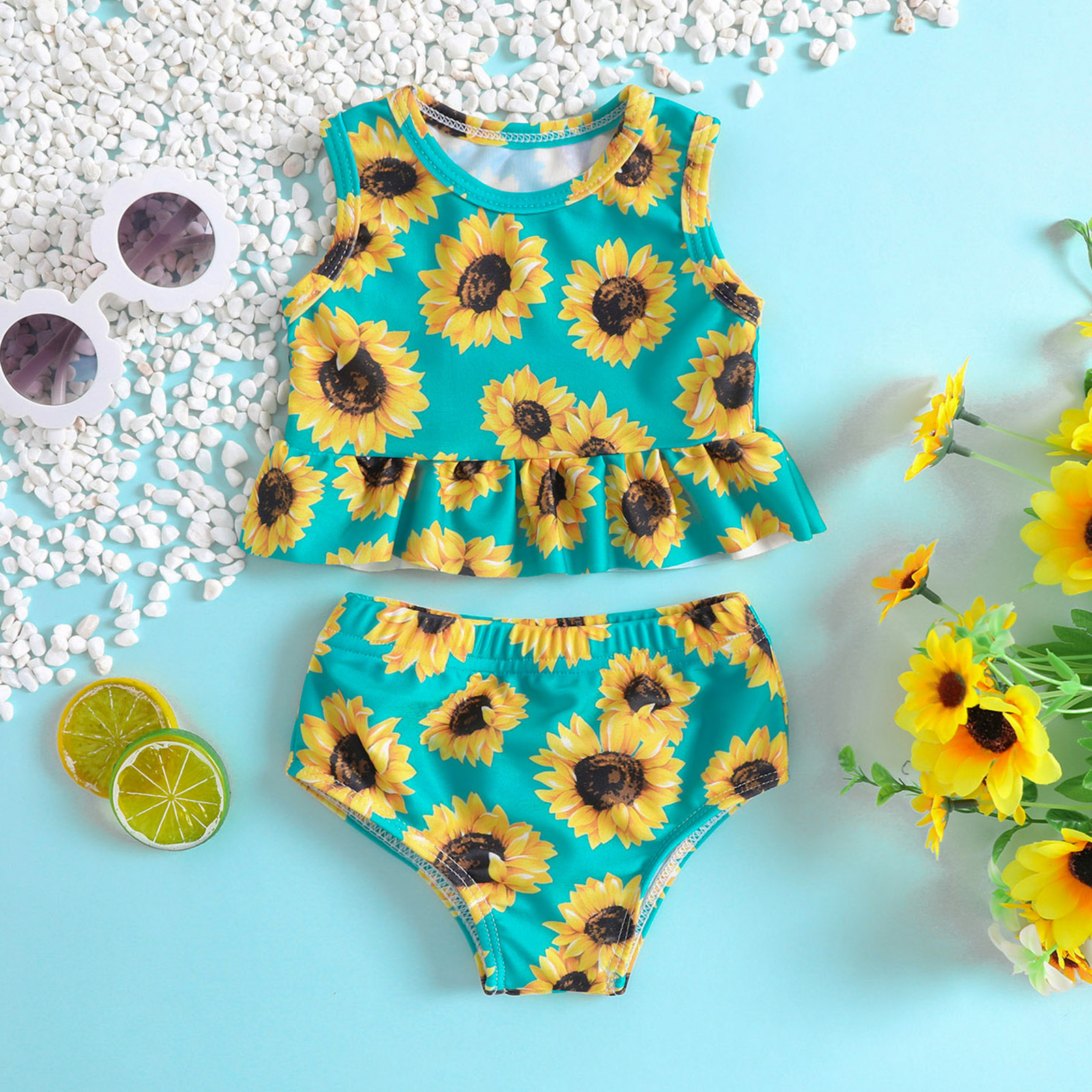해바라기 프린트 프릴 여아 수영복 투피스 세트 아기 소녀의 온천 해변 수영복