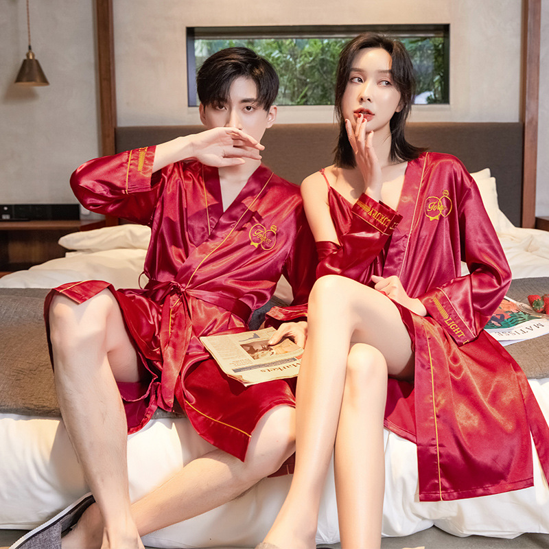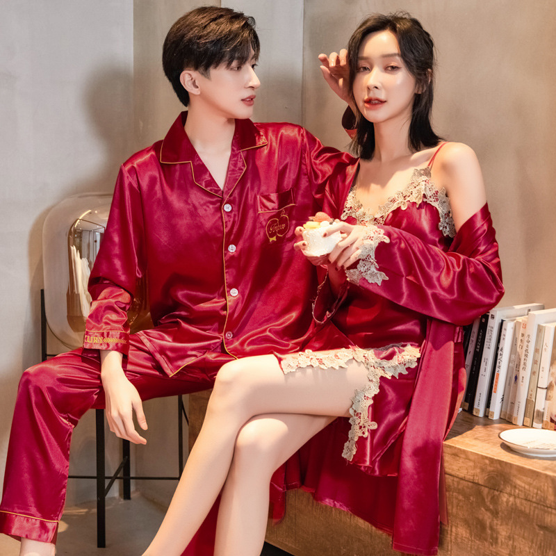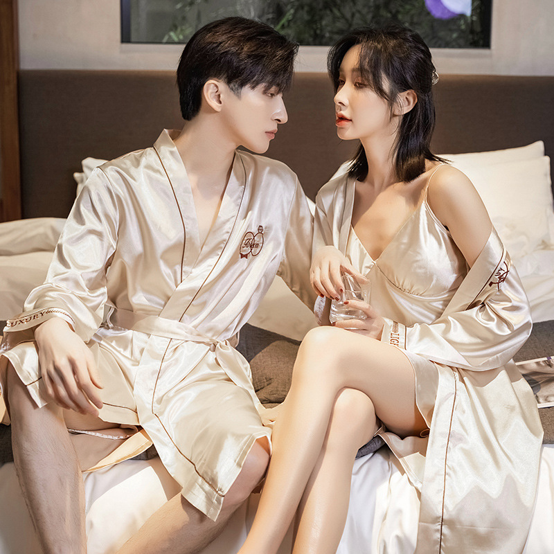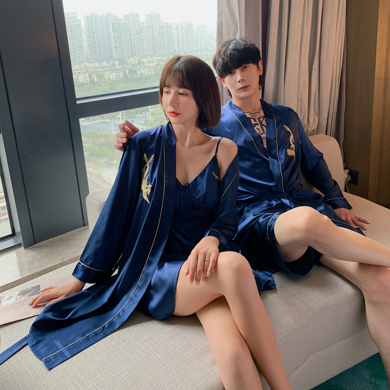 새로운 봄과 가을 실크 커플 잠옷 남자의 잠옷 반바지 여자의 여름 멜빵 섹시한 목욕 가운 투피스 자수 캐릭터스토어 가기