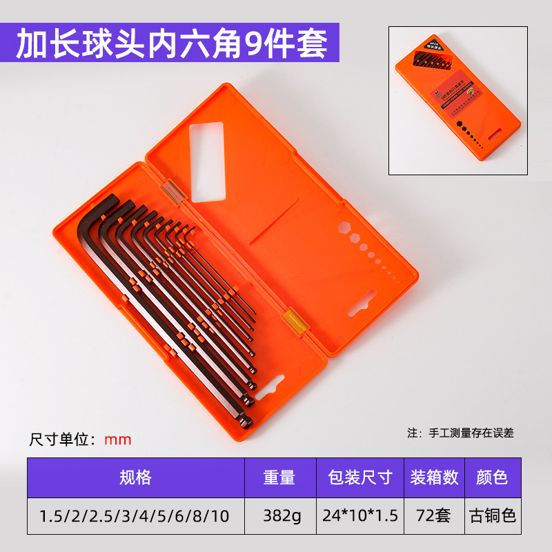 • 박스형 무광 중간 길이 내부 육각형 9개 세트, 각 72세트, 0.365kg