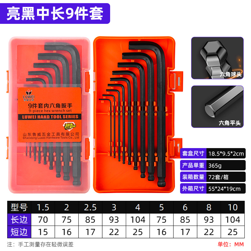 • 박스형 유광 블랙 중간 길이 내부 육각형 9개 세트, 각 72세트, 0.365kg
