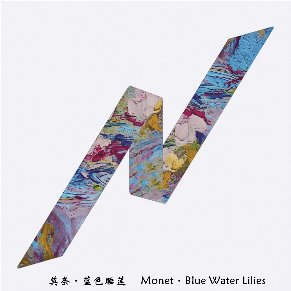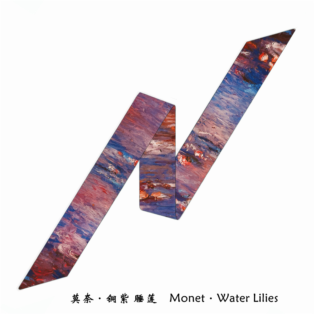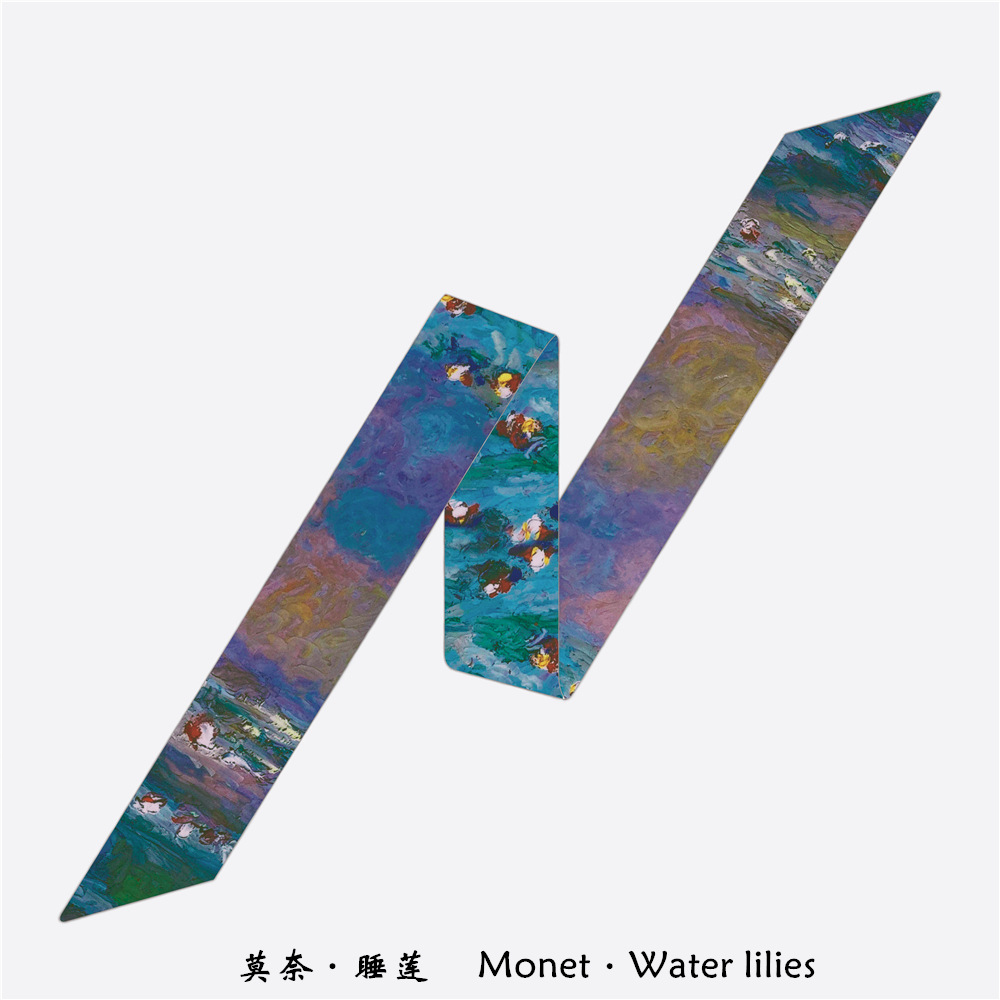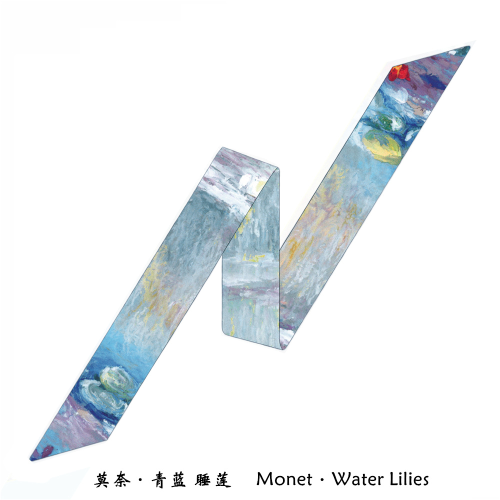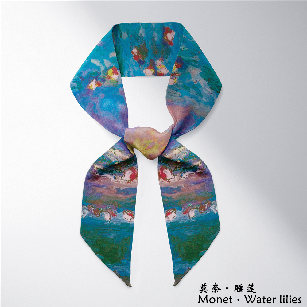 모네 유화 시리즈 물 백합 호수 풍경 여름 말미잘 긴 실크 스카프 넥타이 가방 헤어 밴드 여성용 넥타이 머리