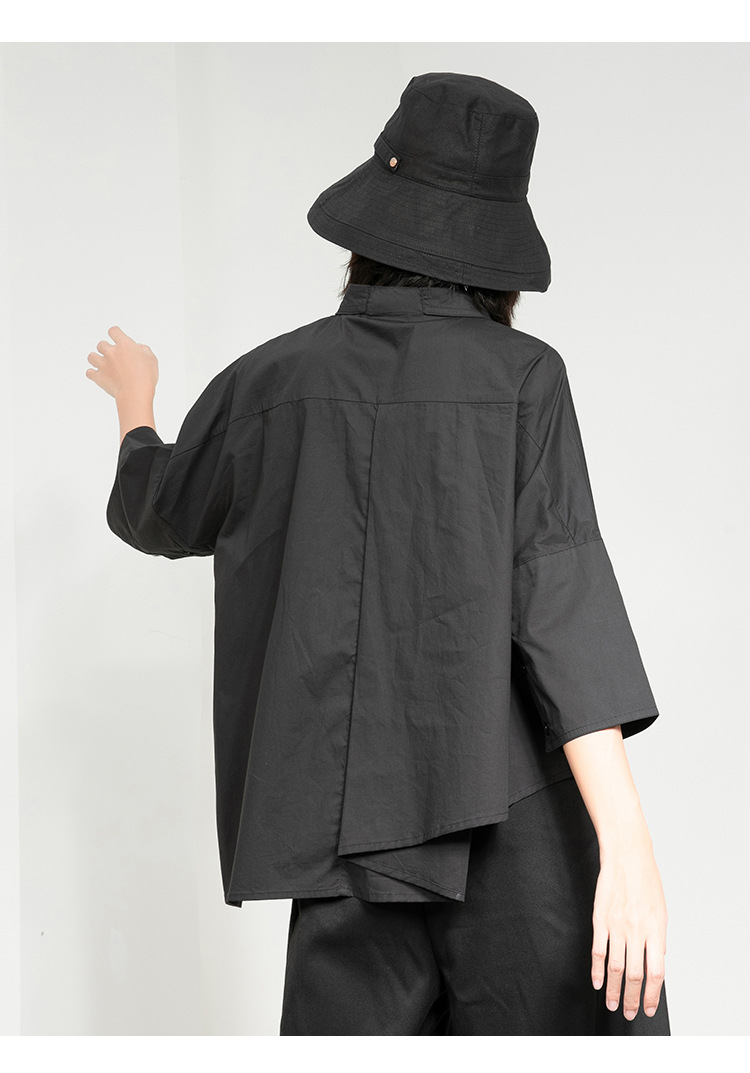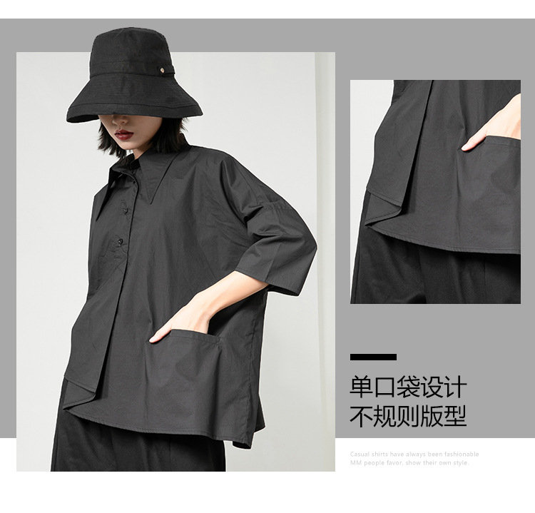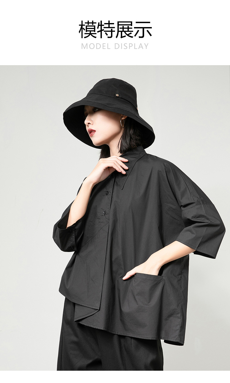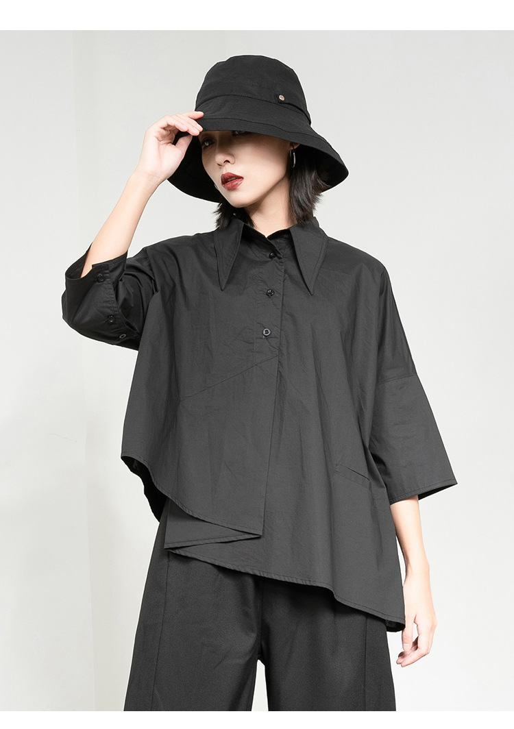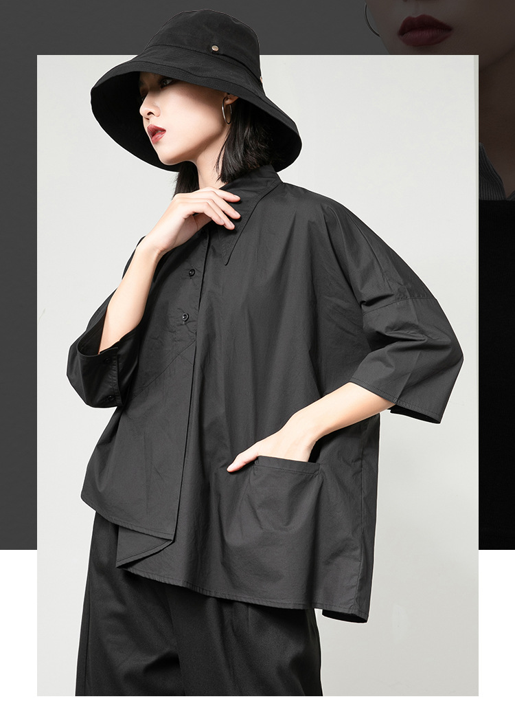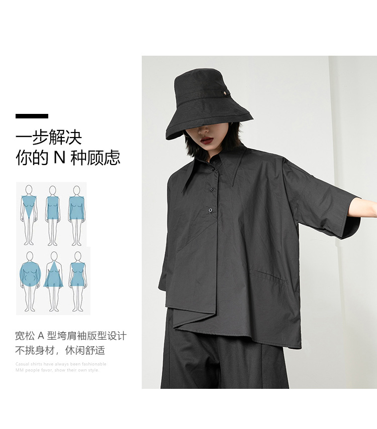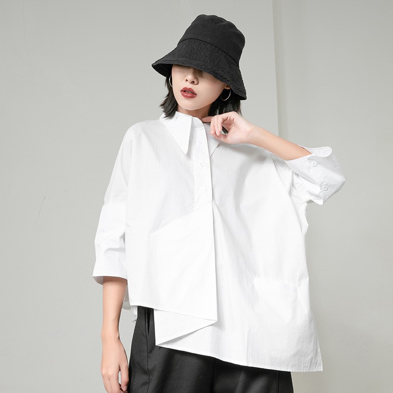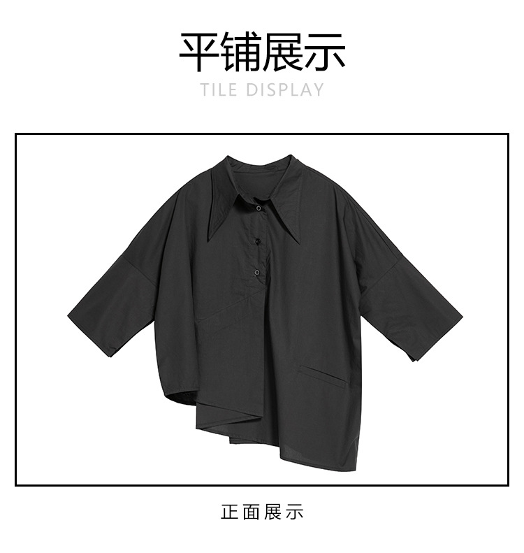 봄과 여름 심플한 여성 셔츠 홍콩 패션 디자이너의 불규칙한 7 점 슬리브 셔츠 느슨한 캐주얼 여성 패션스토어 가기