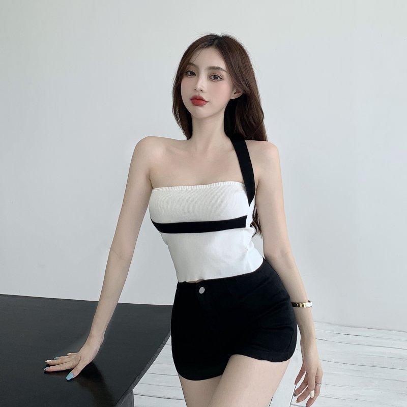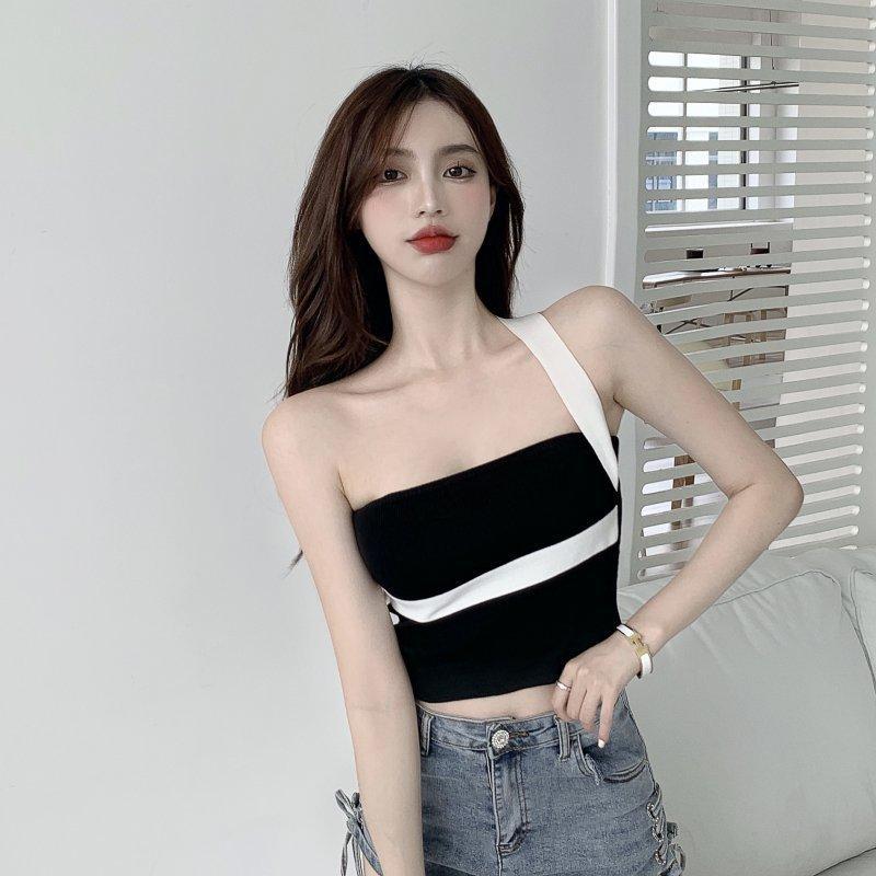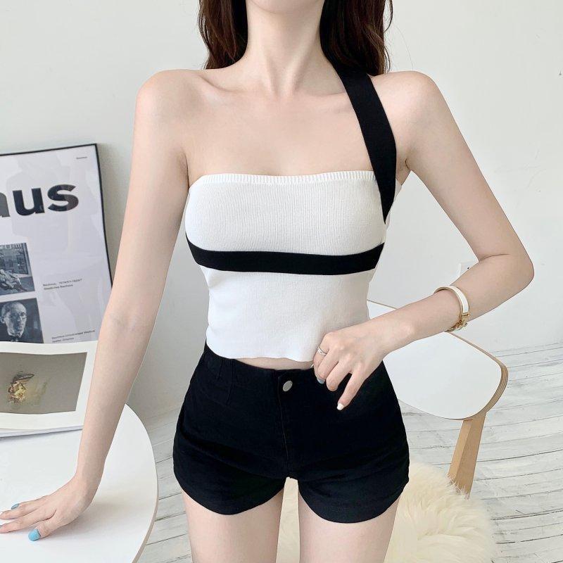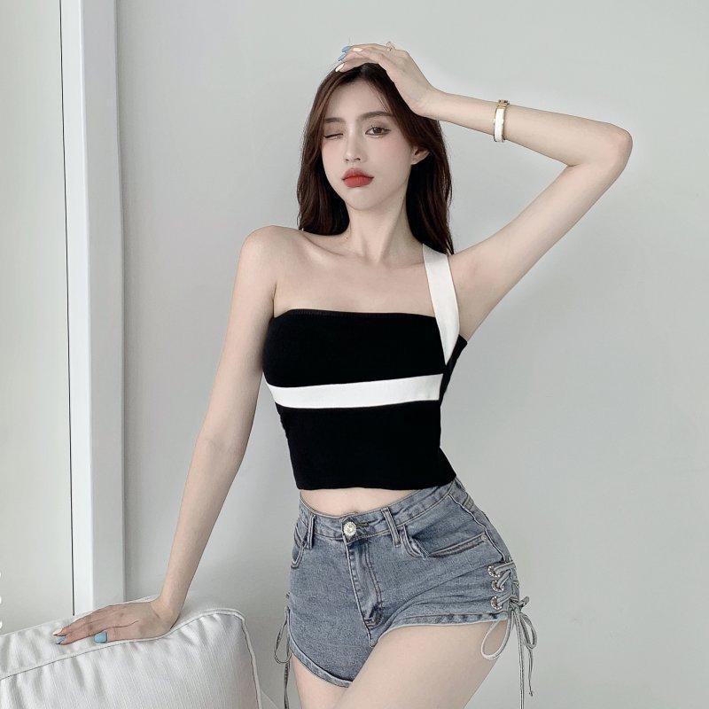 대비 색상 작은 캐미솔 여성의 봄 순수한 욕망 스타일 섹시한 어깨 목 탑 뜨거운 소녀 배꼽 짧은베이스 셔츠