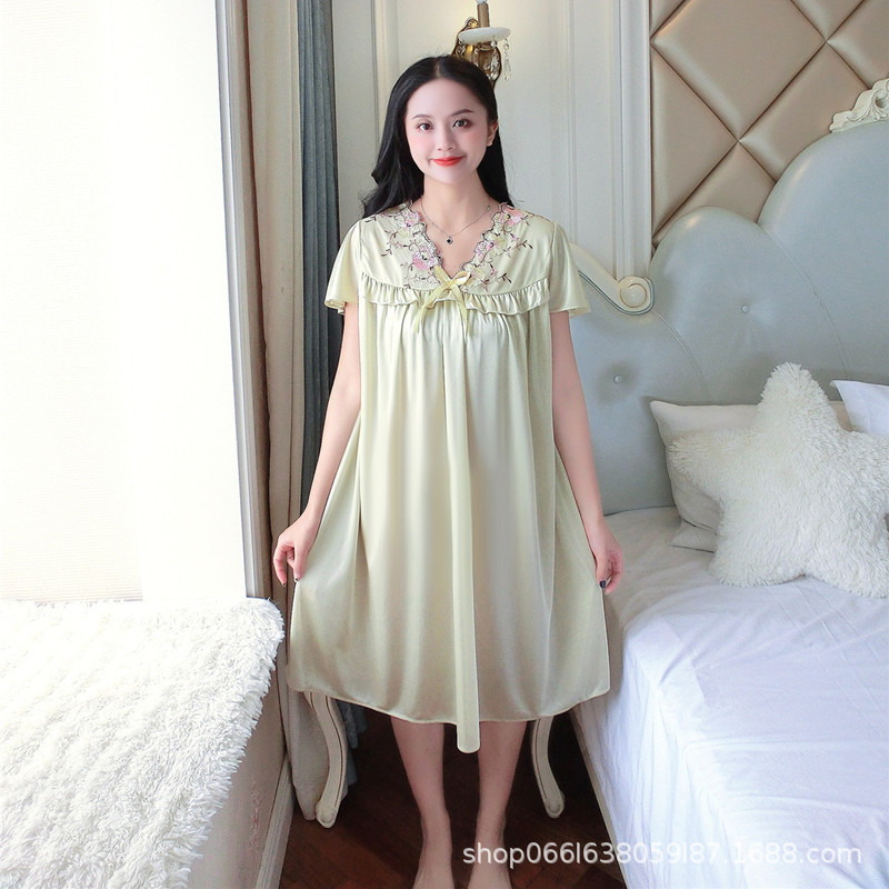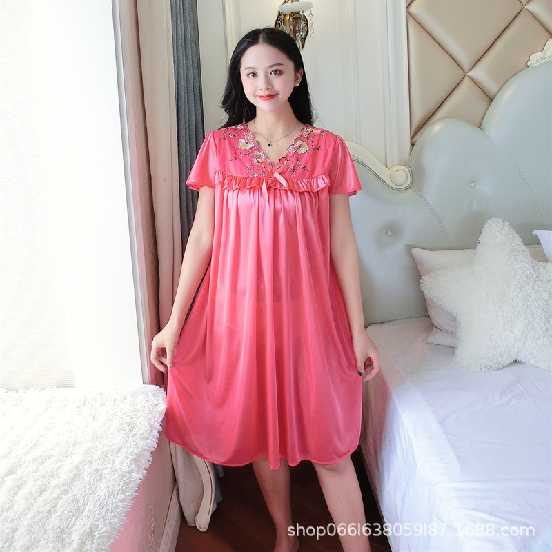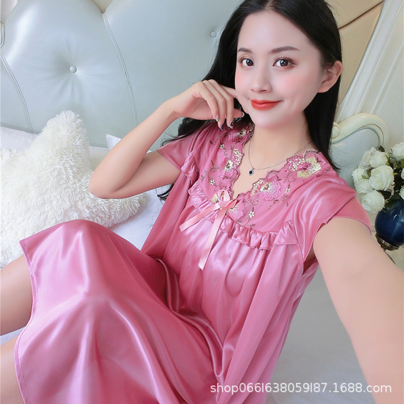 봄과 여름 실크 잠옷 여성용 섹시한 잠옷 여름 반팔 레이스 대형 스윙 스커트 싱글 느슨한 가정 옷스토어 가기
