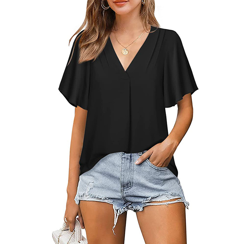 유럽과 미국의 국경 여성 의류 2023 아마존 여름 신작 브이넥 쉬폰 셔츠 플리츠 루즈 반팔 탑