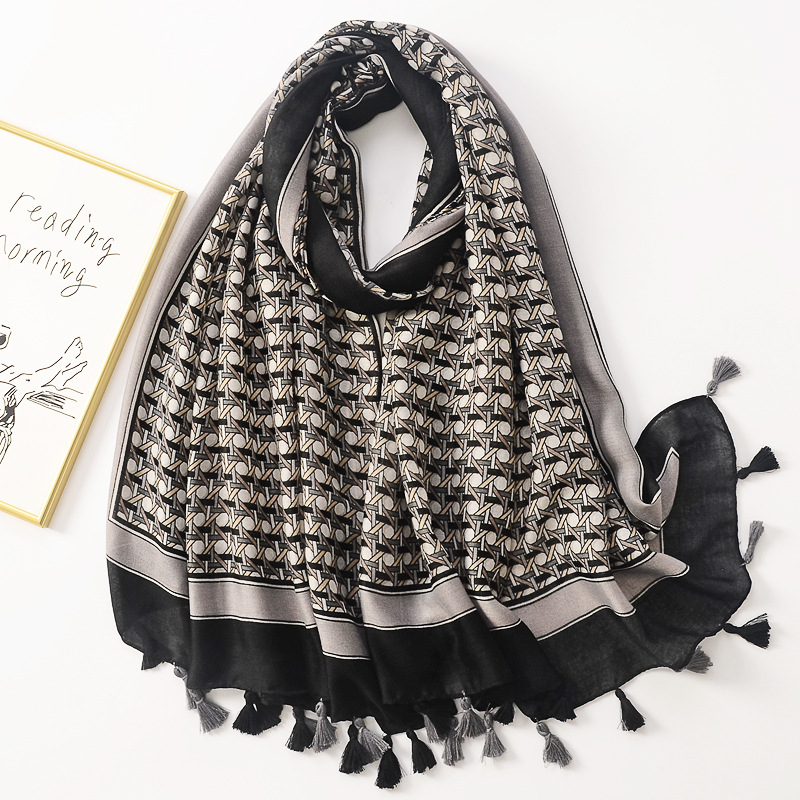 국경 간 대외 무역 뜨거운 판매 프레임 가장자리 기하학 인쇄 면 및 린넨 손 느낌 스카프 예술적 모든 일치 술 스카프 여행 숄