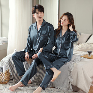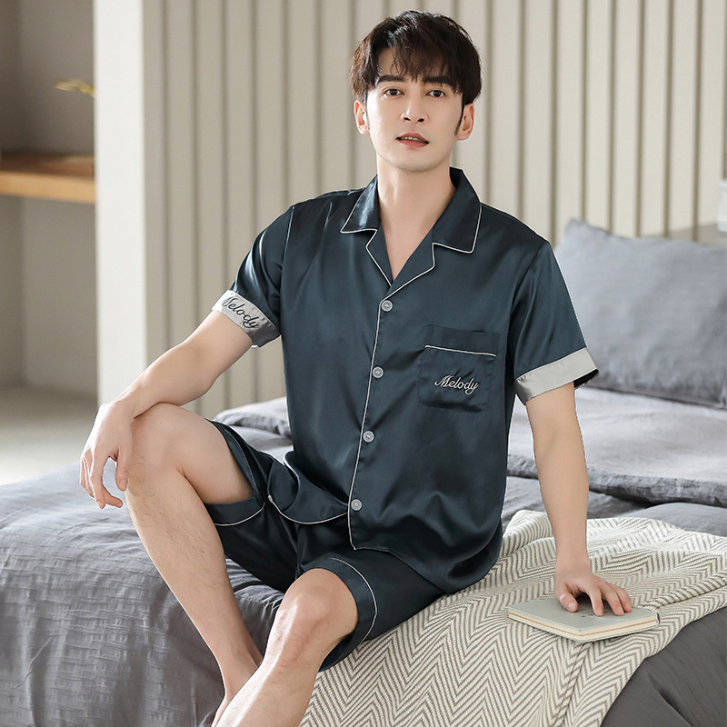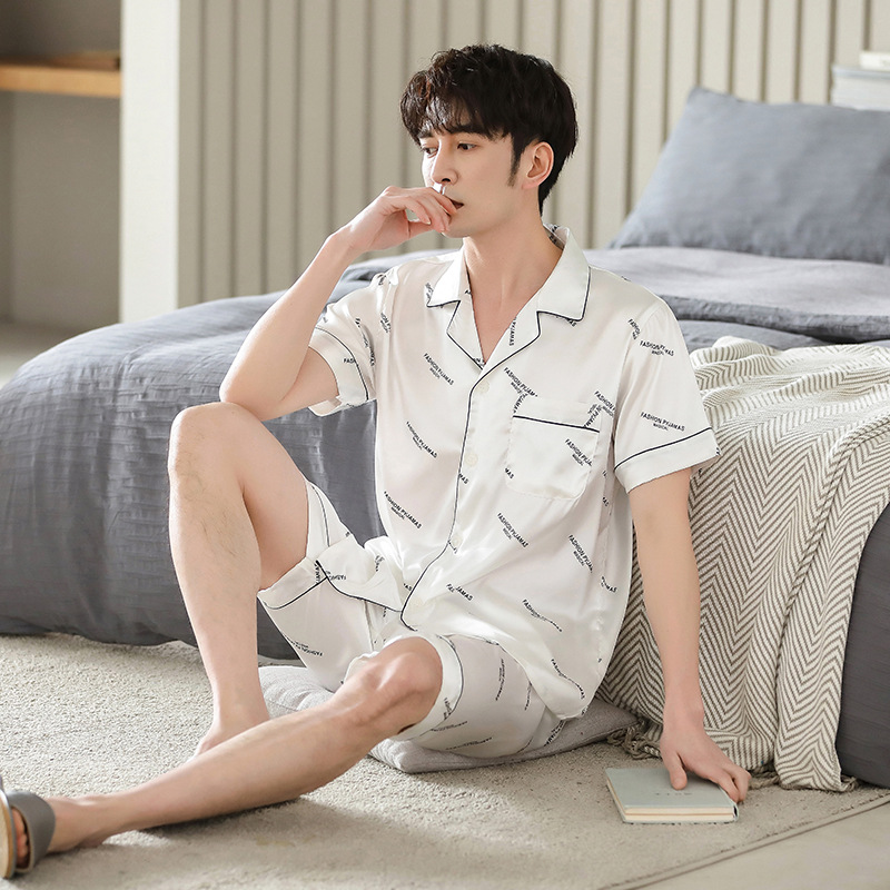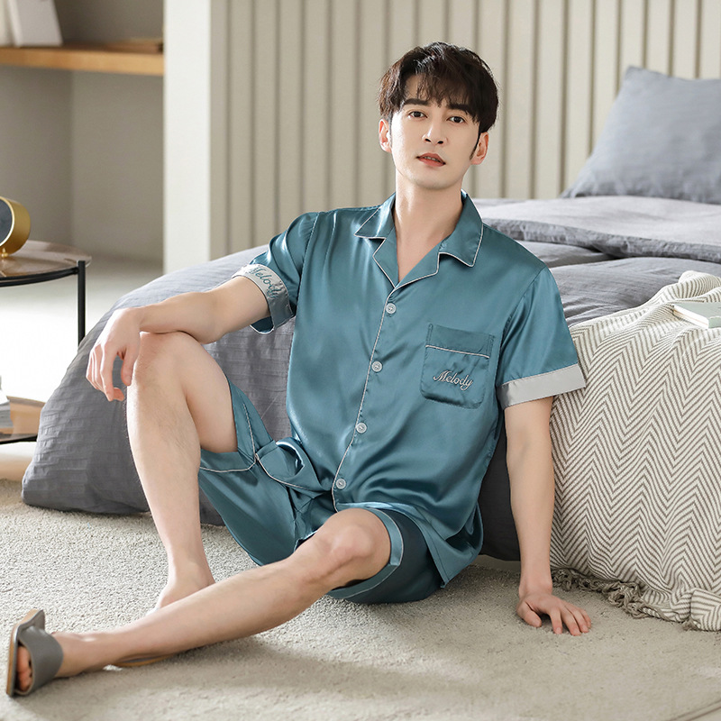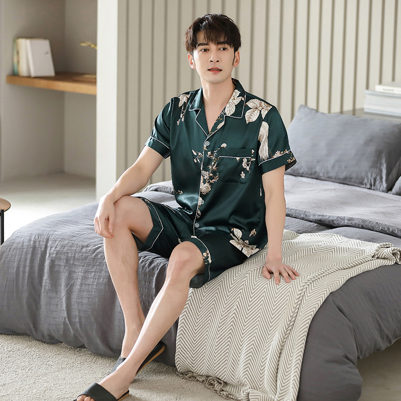 한 Yatong 여름 실크 커플 잠옷 반팔 반바지 남성과 여성의 가정복 자수 인쇄 잠옷 세트 신제품스토어 가기