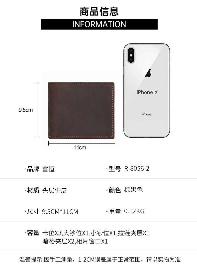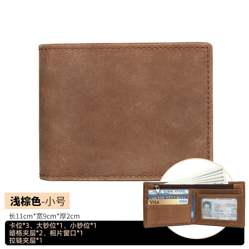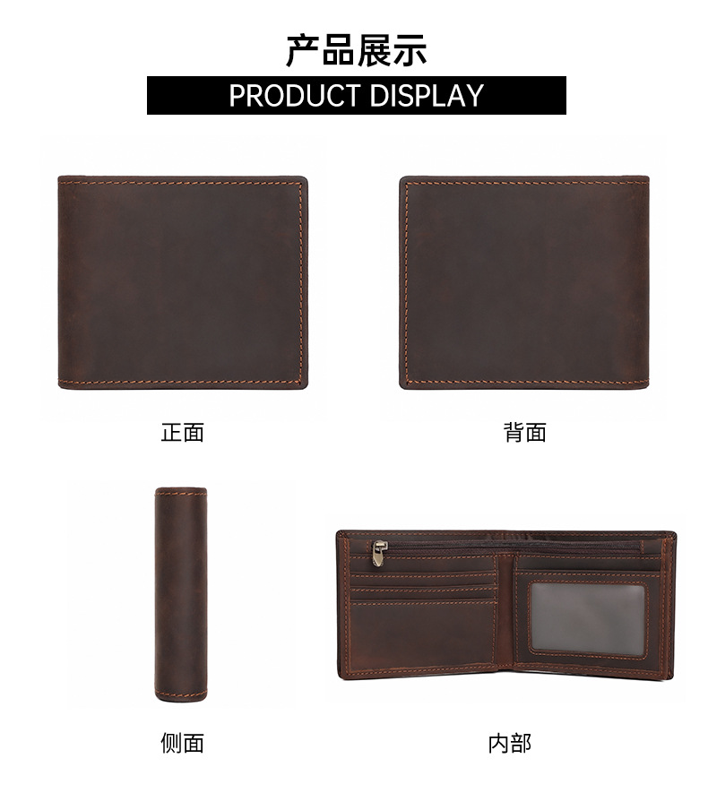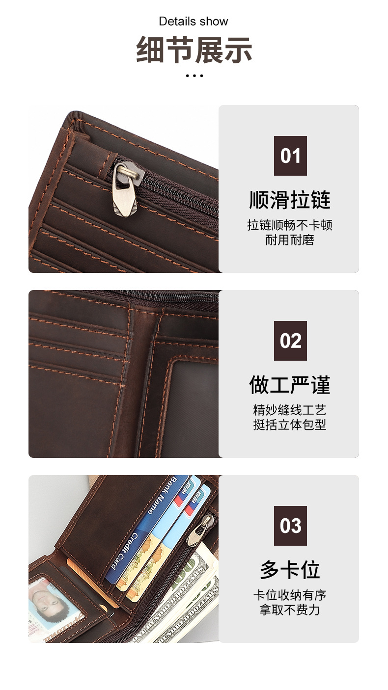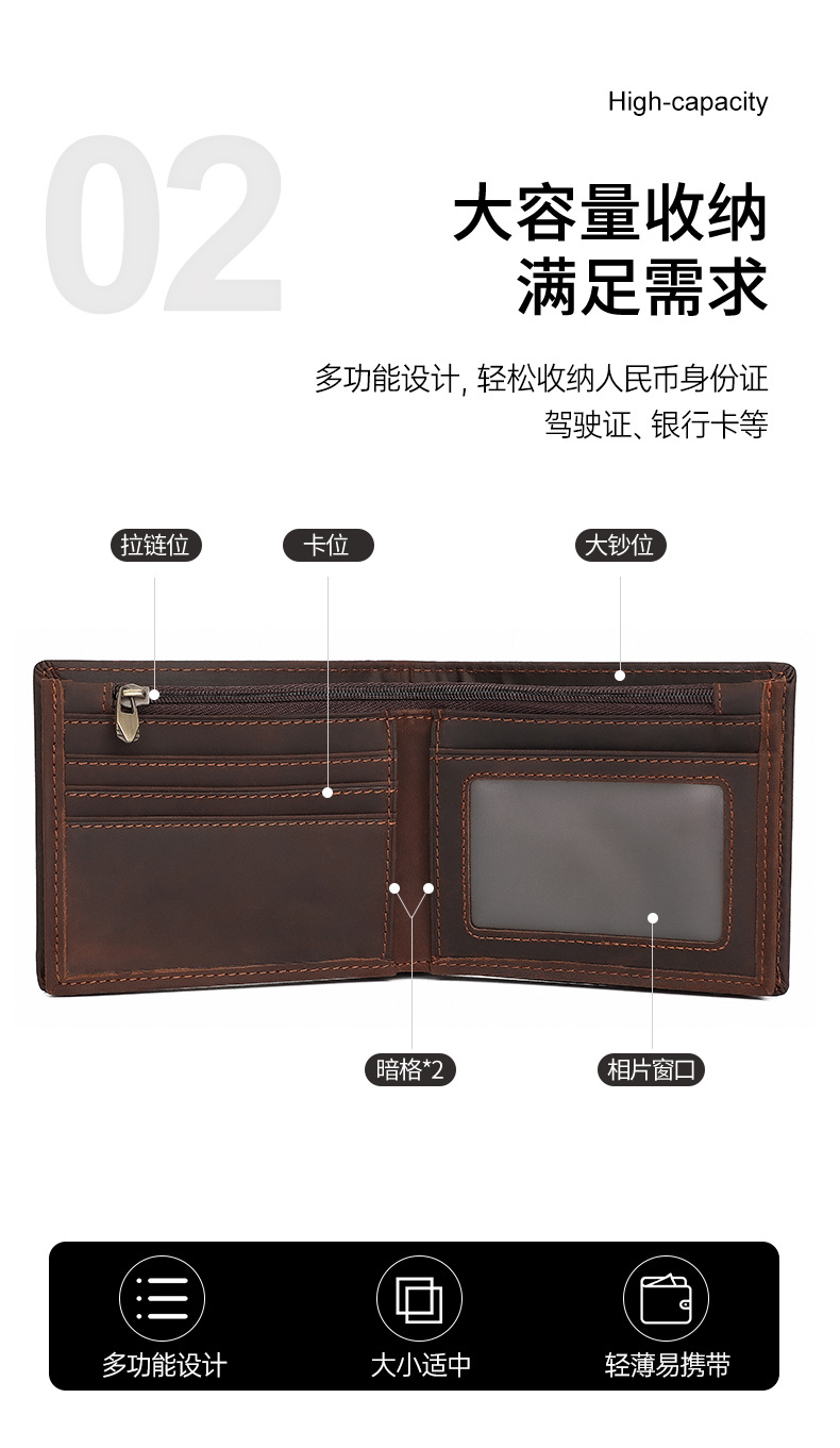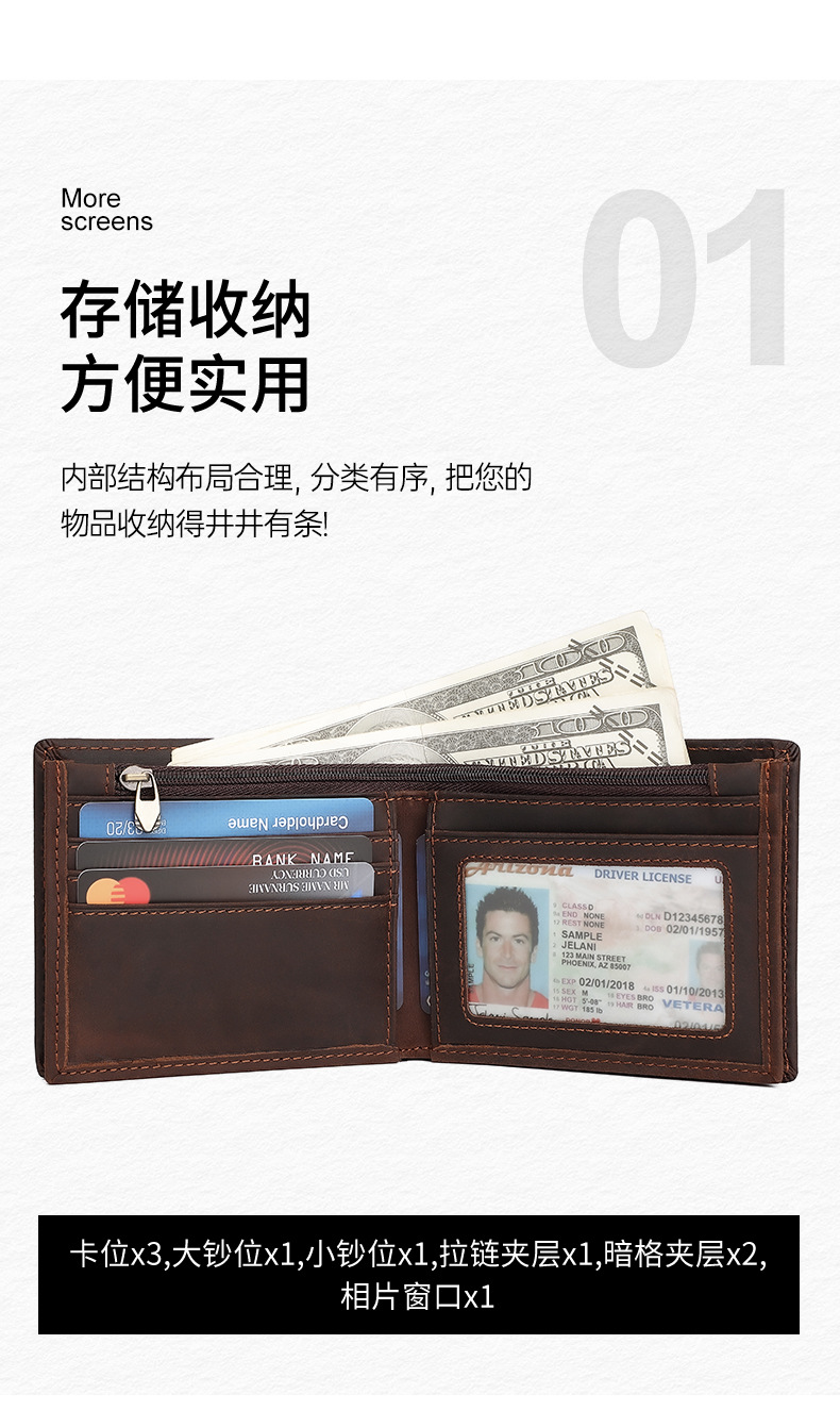 【结构】:卡位x3,大钞位x1,小钞位x1,拉链夹层x1,暗格夹层x2,相片窗口x1