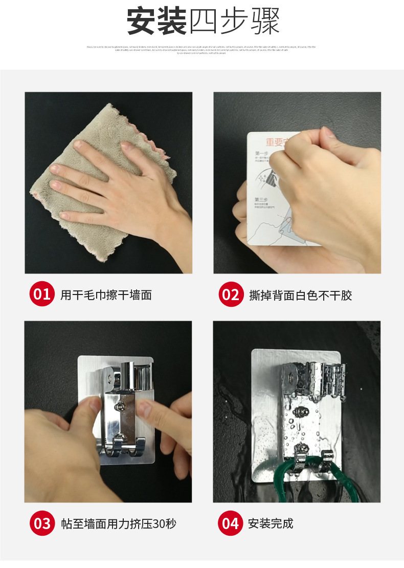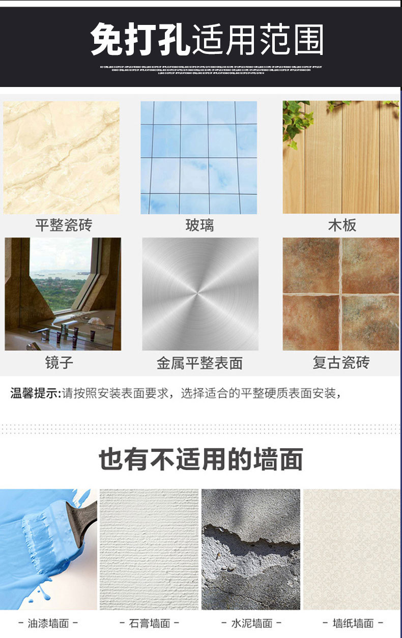 (2)安装请注意,墙面需平整坚固的玻璃瓷砖等,不可用在粉刷墙,墙纸,石灰墙等不平整不坚固的墙面上。上墙后,像手机贴膜一样,把贴片里的空气挤压出来就可以用了。