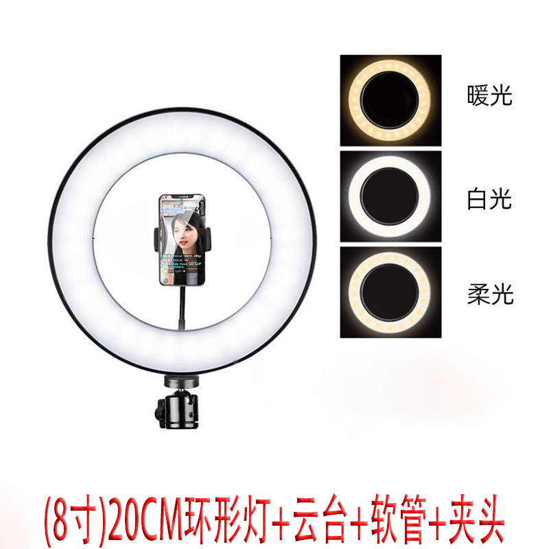 8寸环形灯 ,标配为:8寸环形灯,小云台,一根弯热靴软管夹,包装盒