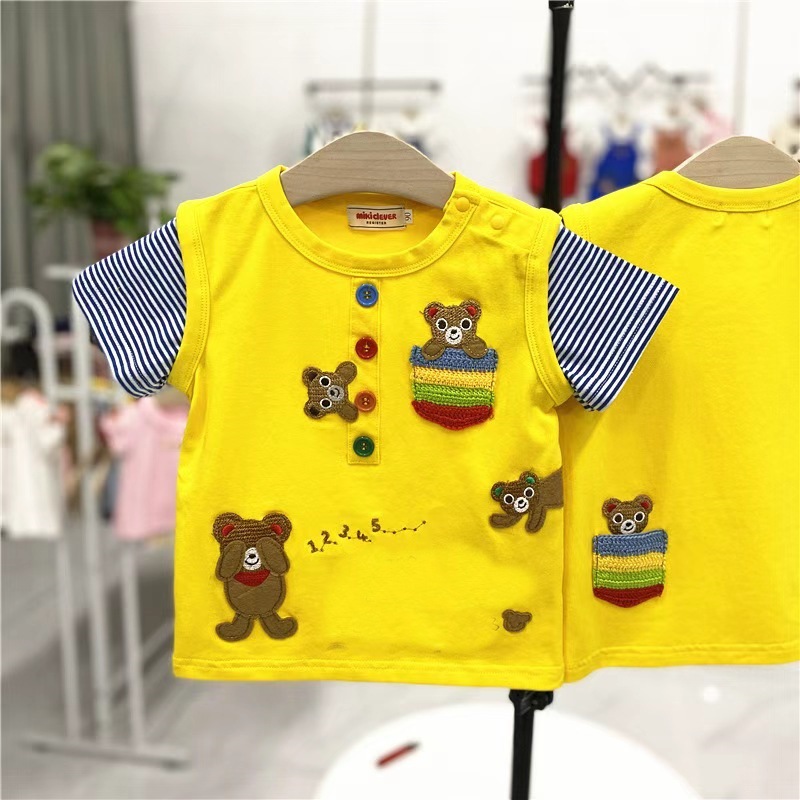 Mikeclever 어린이 반팔 22 봄과 여름 일본 새로운 만화 곰 컬러 슬리브 가짜 투피스 티셔츠 2770