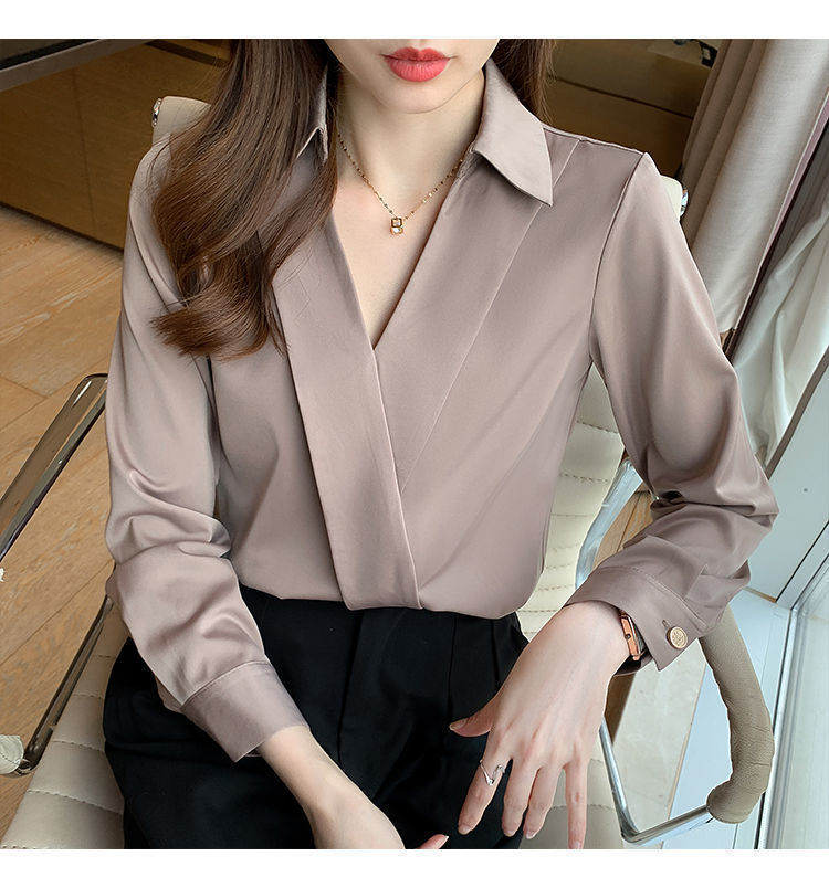가을 2022 새로운 긴팔 셔츠 여성용 슬림 핏 심플 라이트 성숙한 스타일 작업장 우아한 섹시한 새틴 셔츠 여성 의류