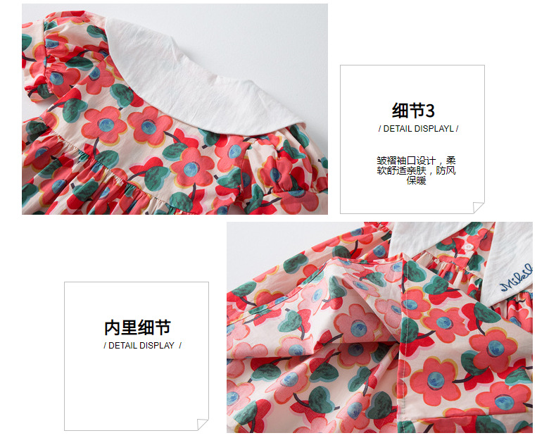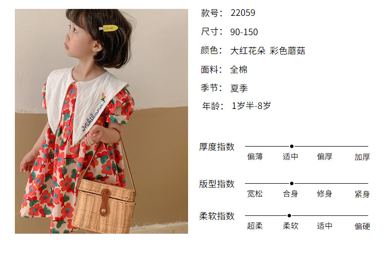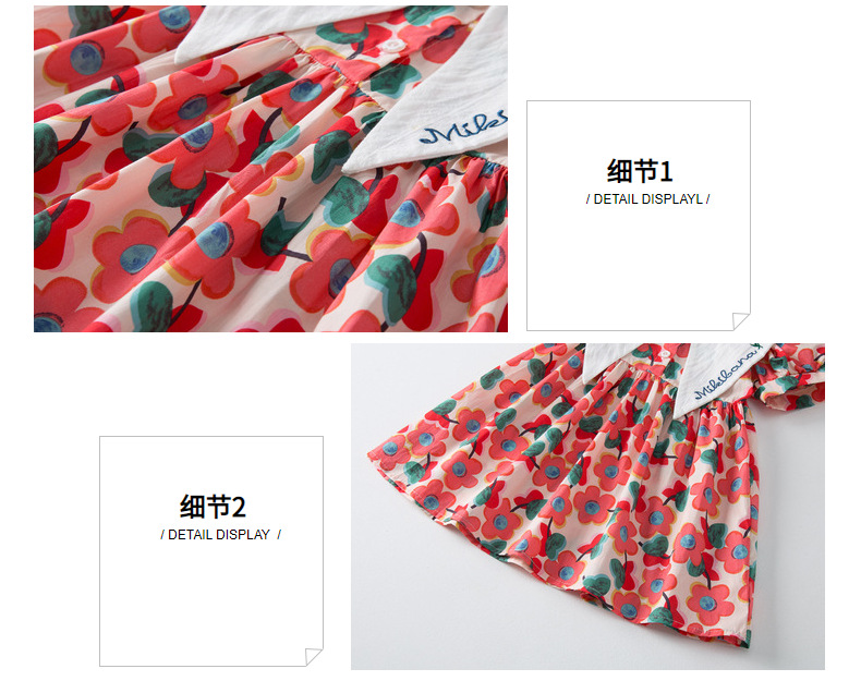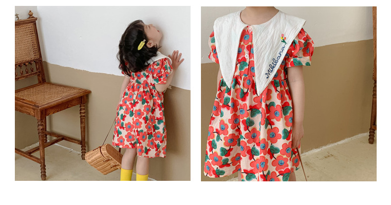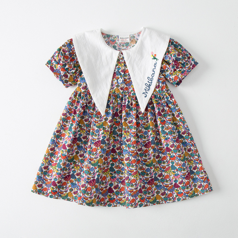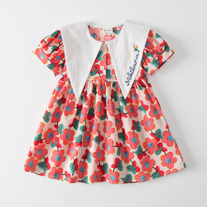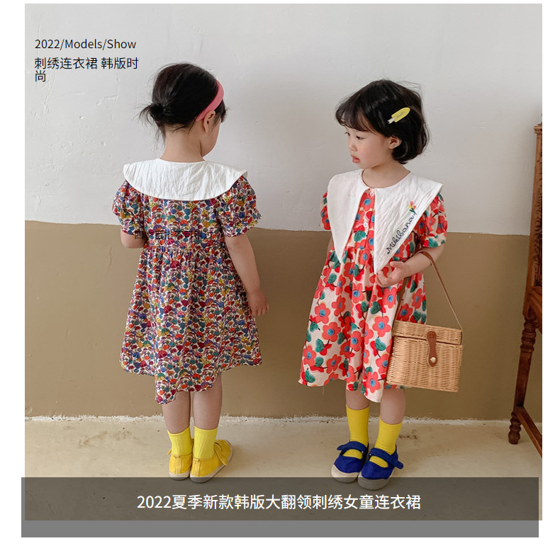 Duducream 한국 아동복 큰 옷깃 수 놓은 소녀 원피스 어린이 꽃 반팔 치마