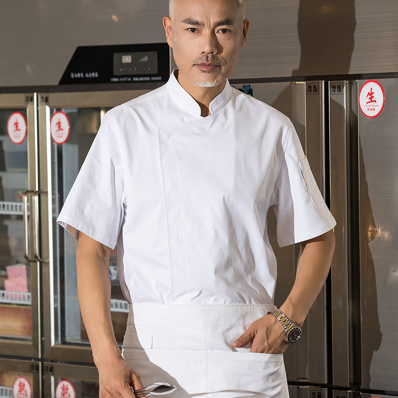 호텔 요리사 의류 반팔 여름 매점 흰색 후면 주방 작업복 남성 및 여성용 통기성 땀 흡수 얇은 작업복스토어 가기