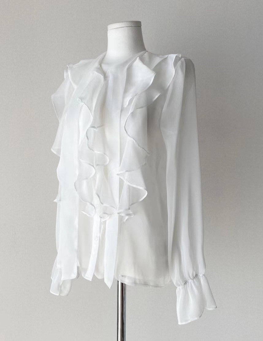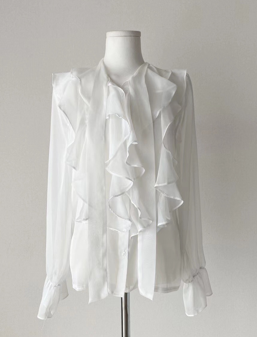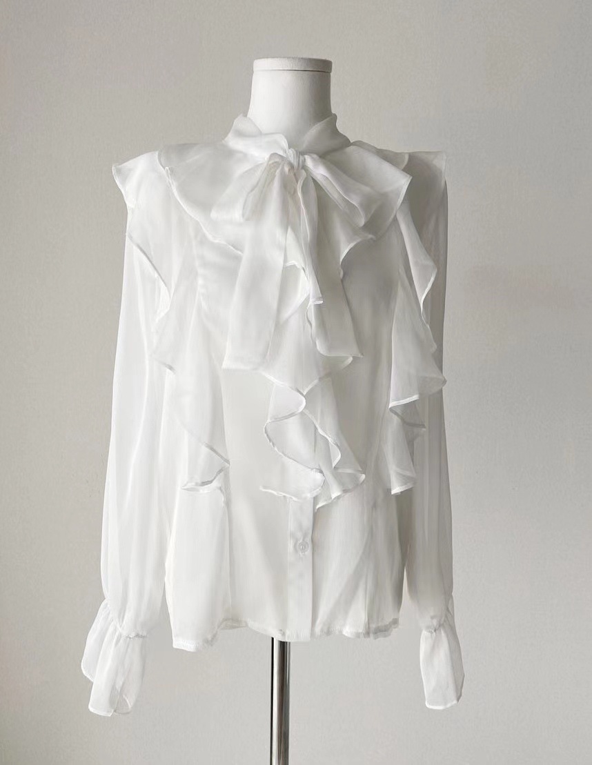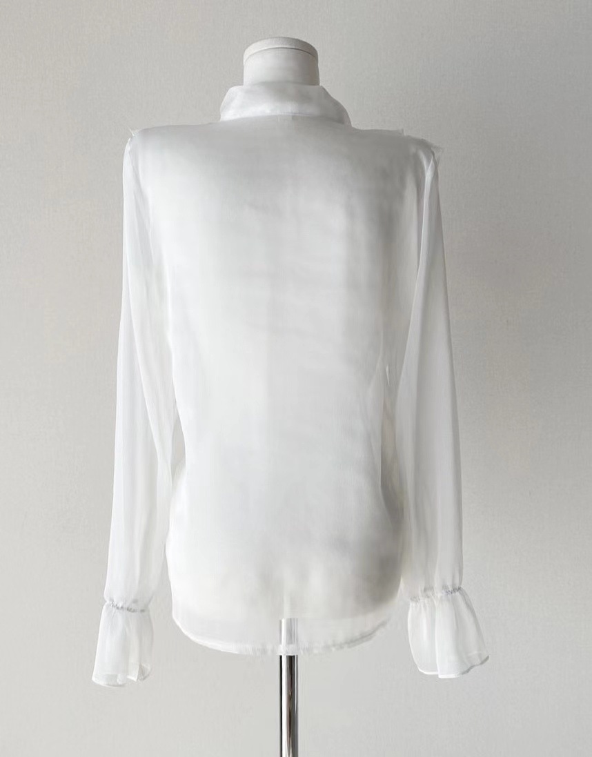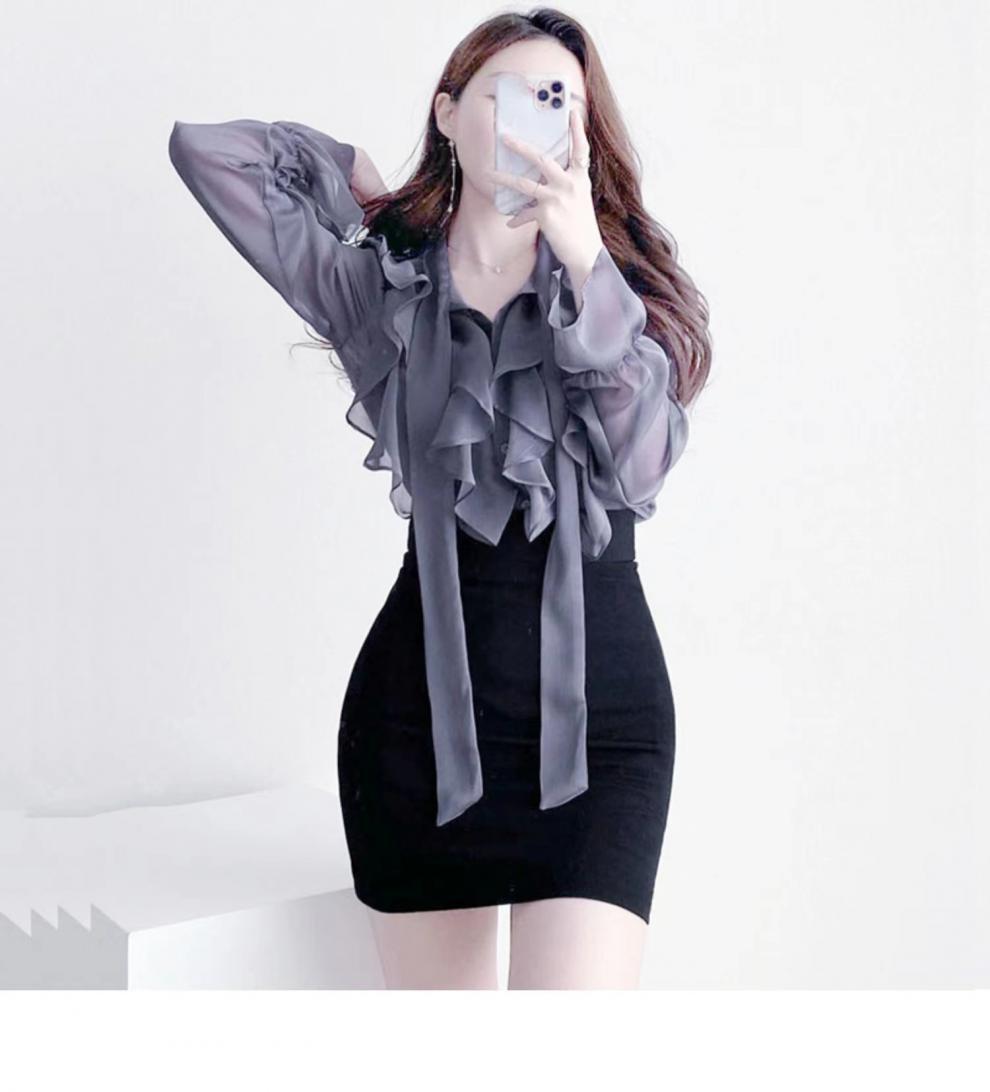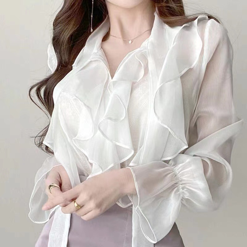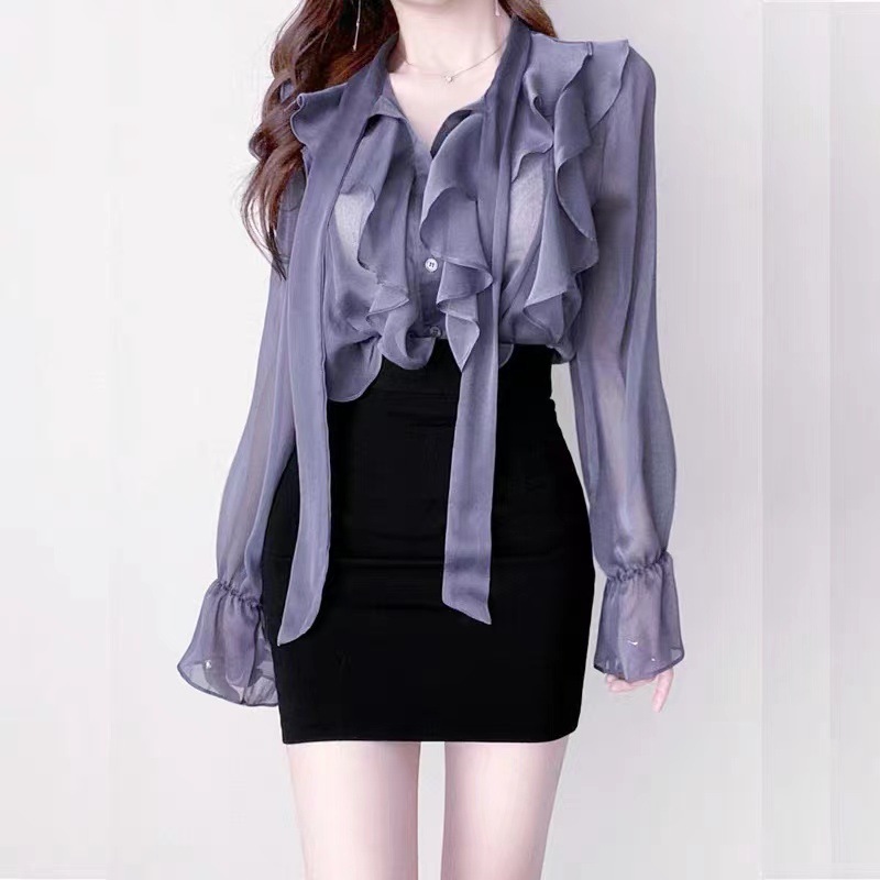 여름 새로운 우아한 달콤한 기질 쉬폰 셔츠 주름 레이스 업 플레어 긴 소매 셔츠 약간 투명한 단색 탑