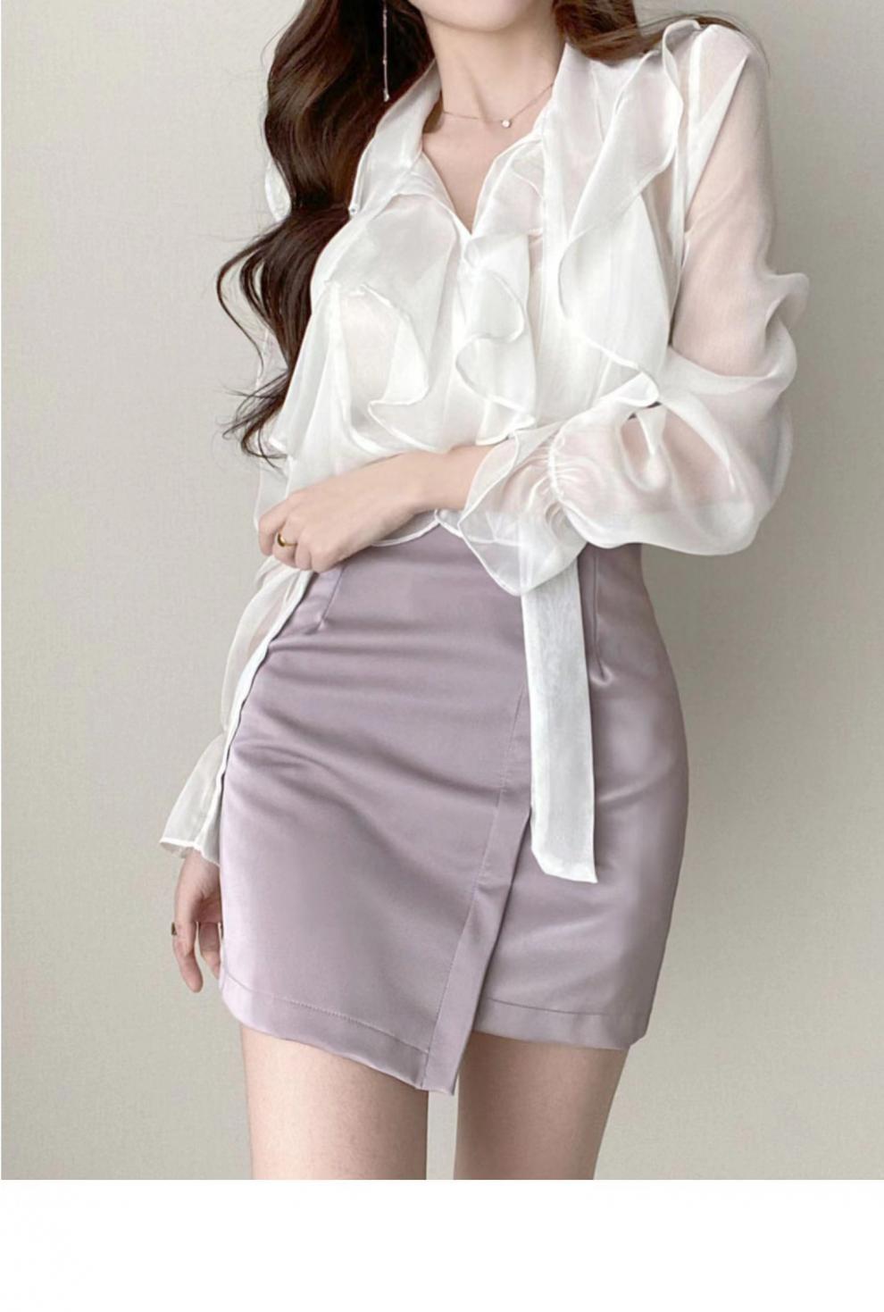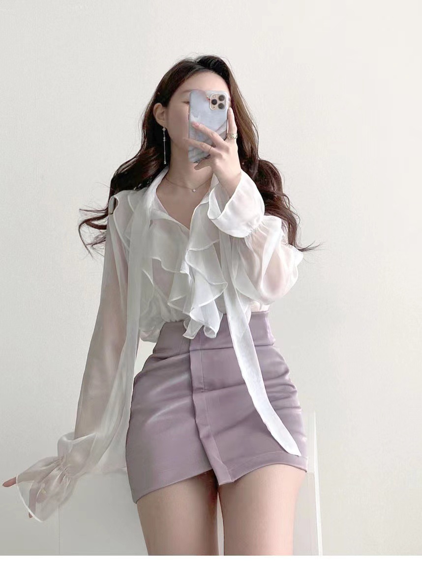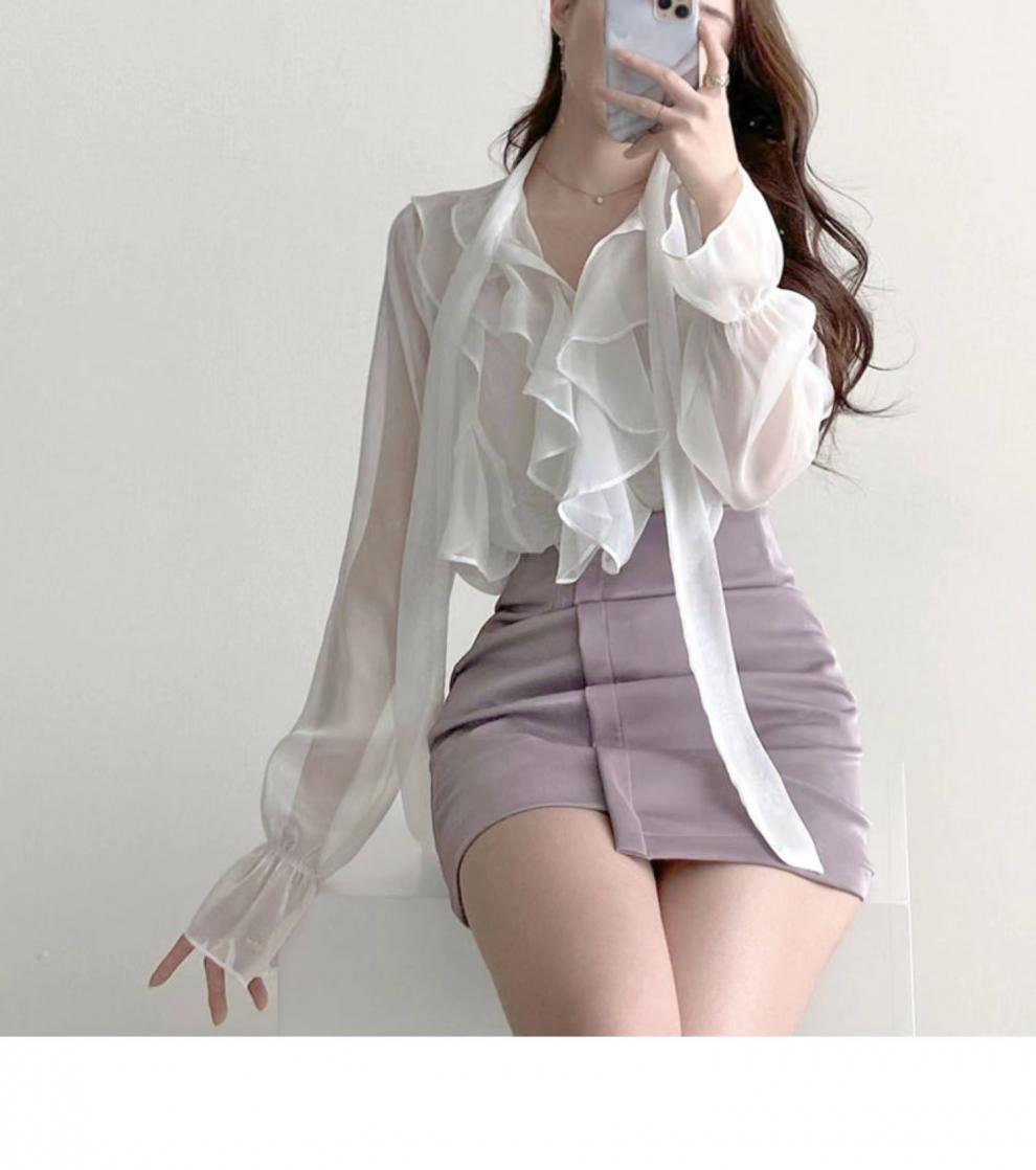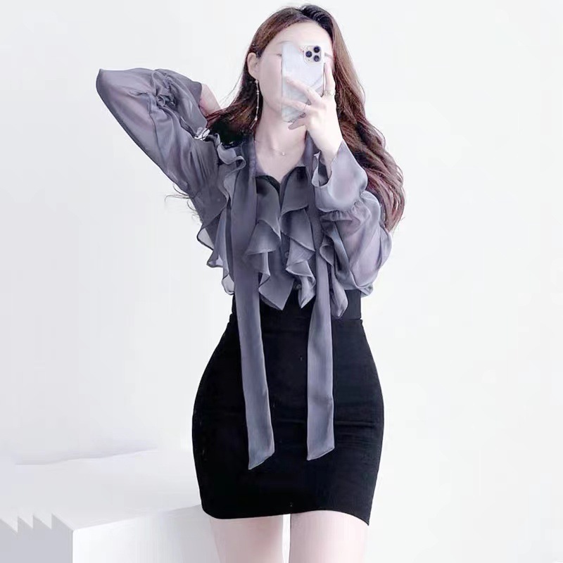 여름 새로운 우아한 달콤한 기질 쉬폰 셔츠 주름 레이스 업 플레어 긴 소매 셔츠 약간 투명한 단색 탑스토어 가기