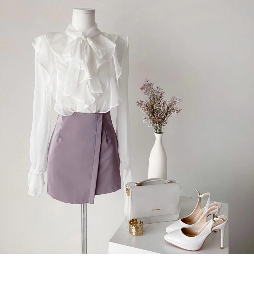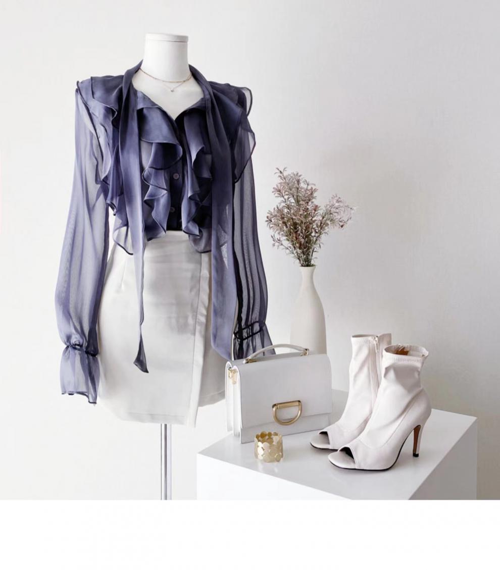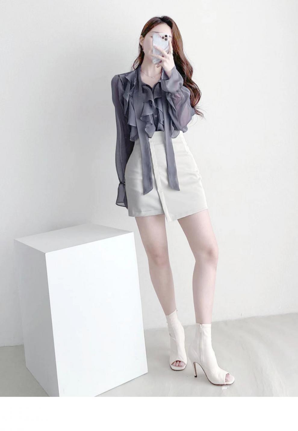 여름 새로운 우아한 달콤한 기질 쉬폰 셔츠 주름 레이스 업 플레어 긴 소매 셔츠 약간 투명한 단색 탑스토어 가기