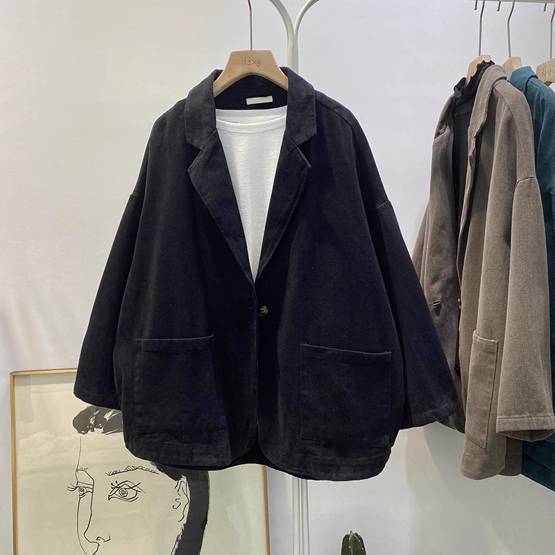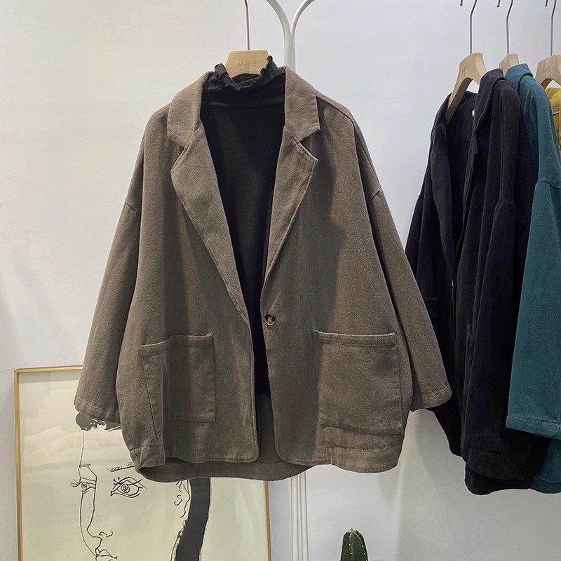 여성을위한 뜨거운 판매 봄, 가을 복고풍 능직 코튼 재킷 V 넥 탑 재킷과 긴팔 느슨한 작은 양복스토어 가기