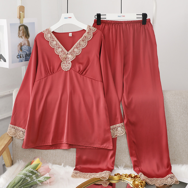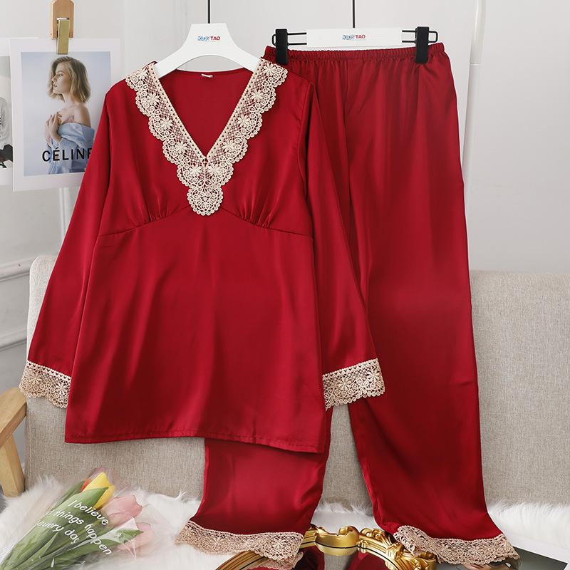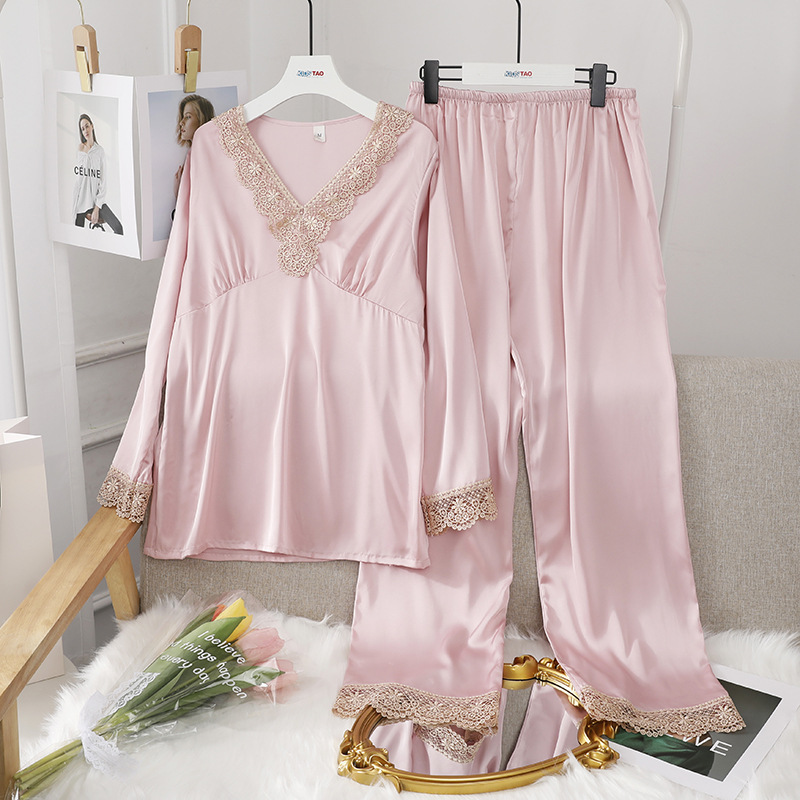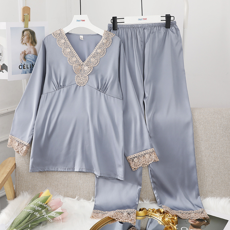 파자마의 세대 여성의 아이스 실크 봄과 가을 긴 소매 얇은 V-넥 캐주얼 실크 가정 옷 세트