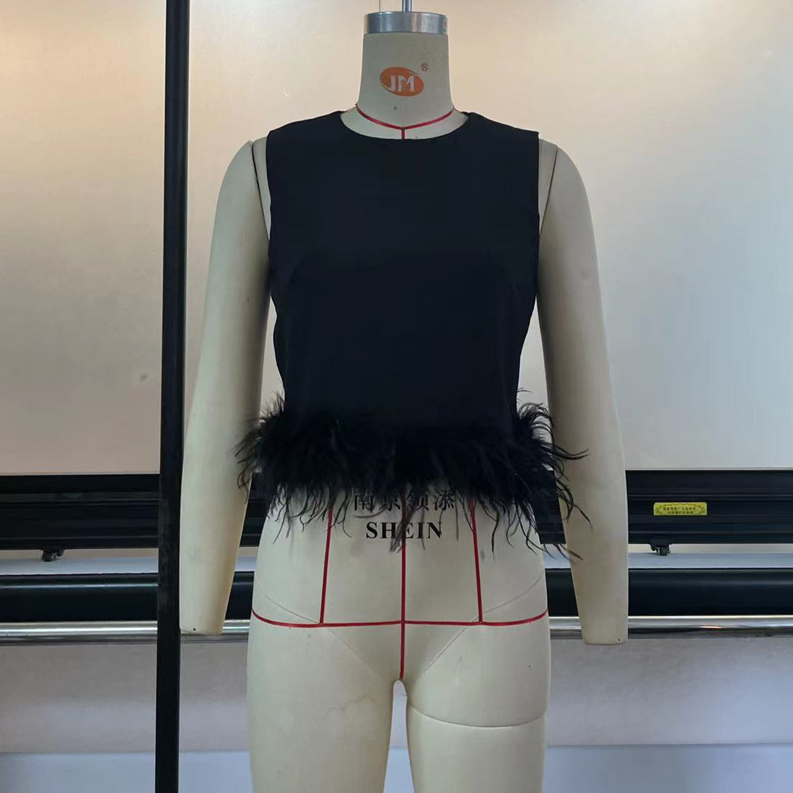 크로스 국경 대외 무역 여름 모피 가장자리 조끼 단색 밑단 스티치 깃털 라운드 넥 민소매 탑 여성용 SU2890