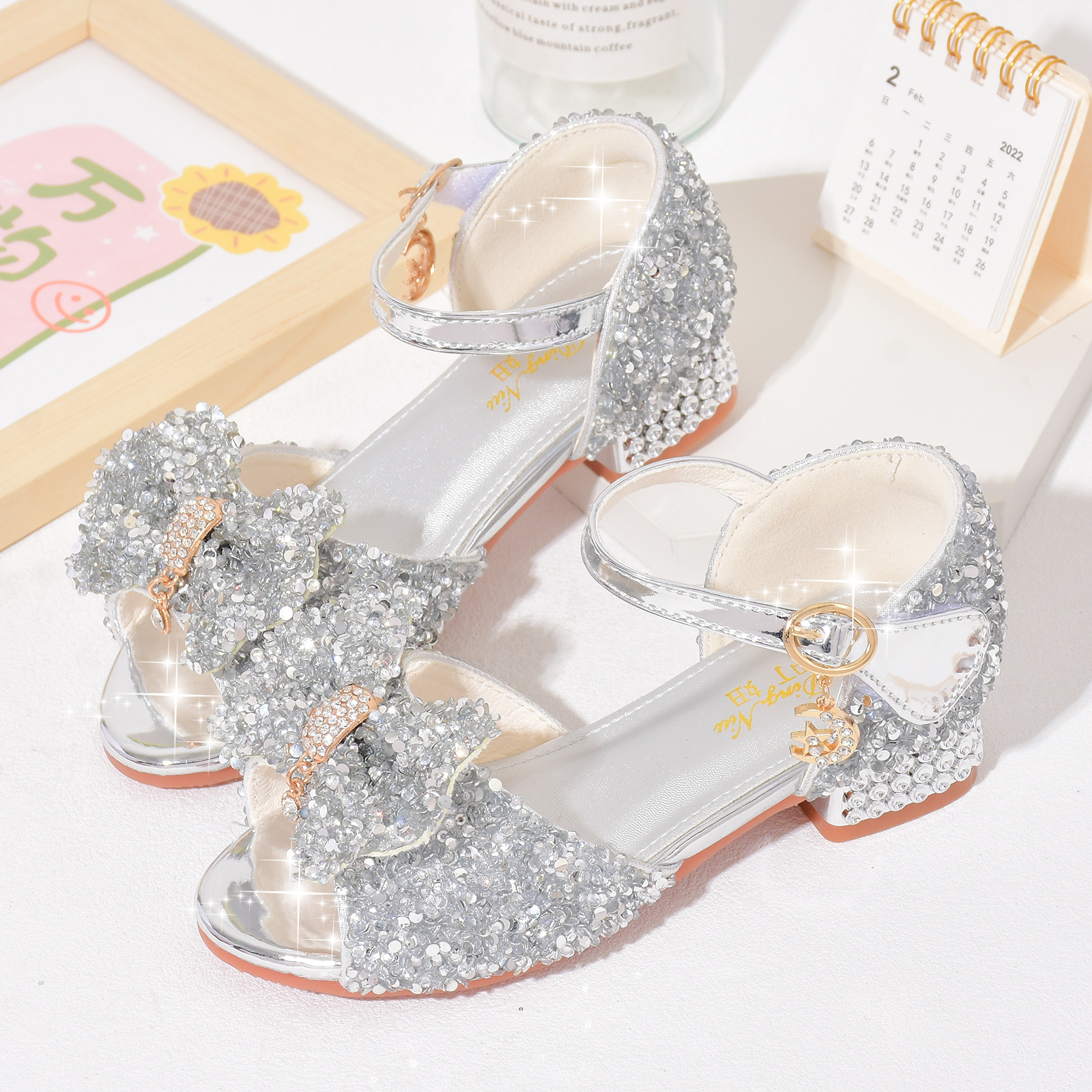 여자 하이힐 2022 새로운 빛나는 활 소녀 크리스탈 신발 여름 공주 신발 부드러운 단독 어린이 샌들