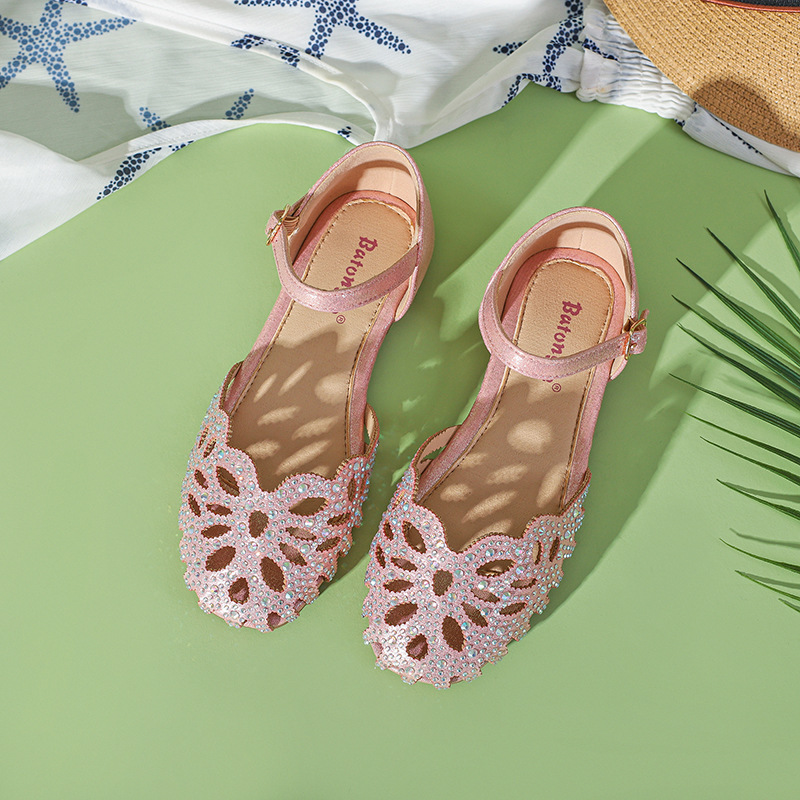 여아 샌들 공주 신발 2023 한국 여름 중대형 어린이 소프트 솔 미끄럼 방지 중공 서양식 어린이 크리스탈 신발