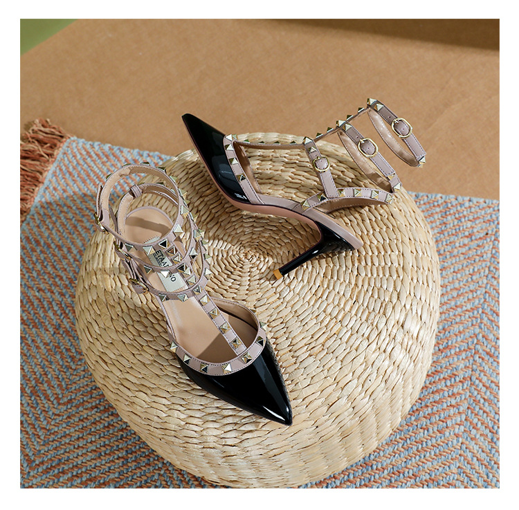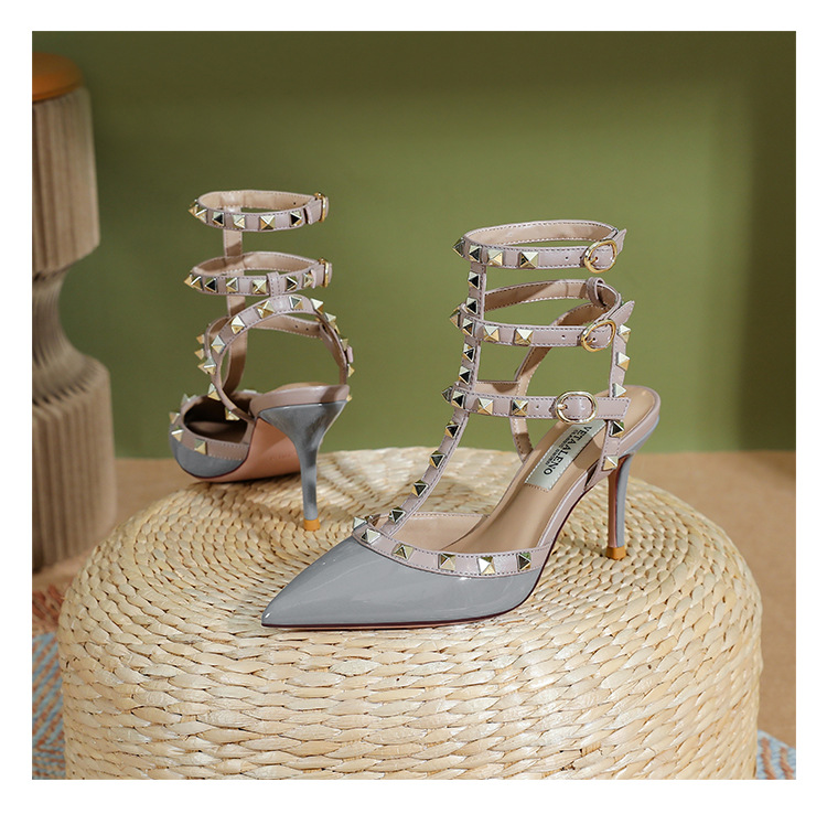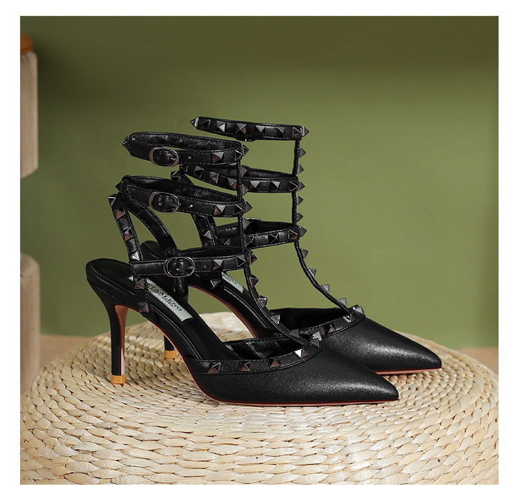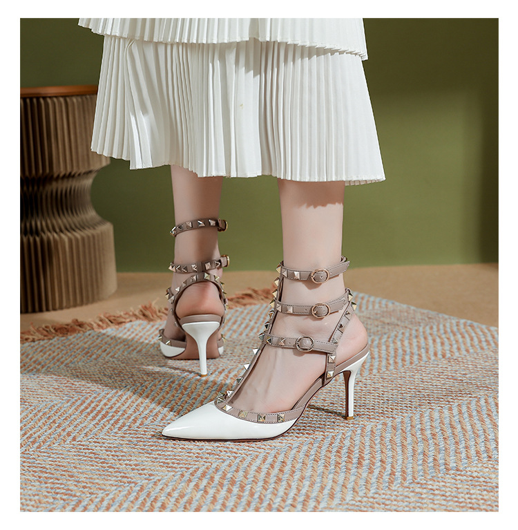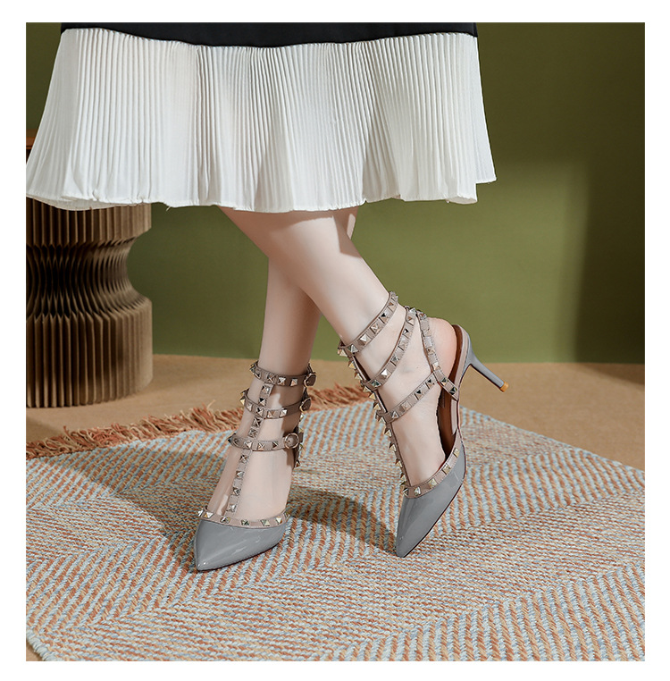리벳 장식 슈즈, 뾰족한 앞코, 얇은 굽, 삼중 스트랩 샌들, 여성용 패션 하이힐, 유럽풍, 인기 상품스토어 가기